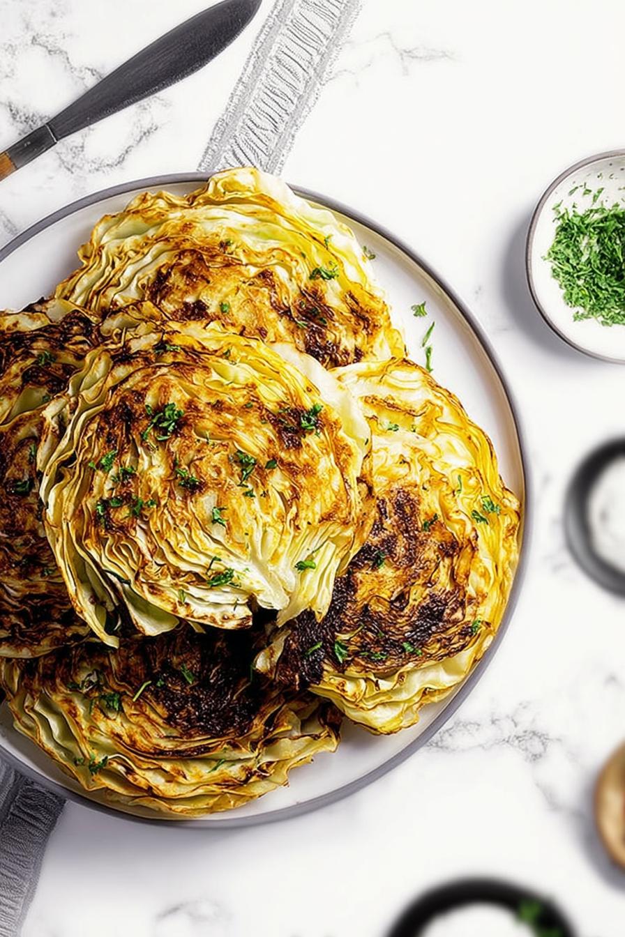 Start by stabilizing the cabbage; cutting the root flat prevents slipping and uneven slices. Thicker slices cook more evenly and stay intact; less than ¾ inch risks breaking. The olive oil and vinegar mix lubricate each steak for caramelization and slight tang—don’t saturate or cabbage becomes soggy. The spice blend layered onto one side directs flavor intensity; sprinkling over edges avoids bland spots between leaves. Brushing oil before seasoning helps the spices adhere. Air fryer temperature set around 365°F balances Maillard reaction without burning the edges. Begin checking near 14 minutes—edges should crisp and brown but not blacken. Flip is optional but usually causes tearing; leave spice side up. Use a flat spatula for gentle removal, minimizing breakage. Post-cook oil brushing softens dry spots and adds flavor shine. Garnish with chopped cilantro and a squeeze of lemon immediately to lift all notes. Watch for wet or limp steaks; cook longer or reduce vinegar next batch. Timing varies with cabbage density and air fryer power; sensory cues beat clock-watching every time.