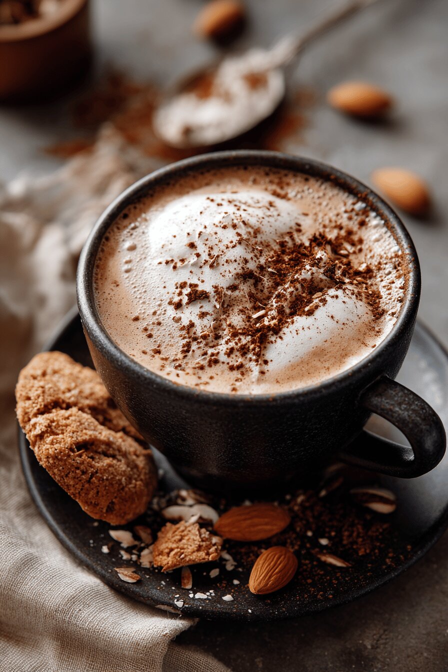 Ditch milk chocolate for dark or bittersweet to deepen flavor and avoid sickly sweetness. Half-and-half substitutes cream to reduce fat slightly but keep mouthfeel. Cocoa powder slightly lowered to balance chocolate, considering added ground almonds that absorb liquid and contribute texture. Ground almonds replace part of sugar crunch and add nutty aroma, must be finely ground to prevent gritty mouthfeel. Orgeat syrup classic almond flavor without introducing alcohol; extract valid but weaker so syrup preferred. Frothing with almond milk brings true almond layer in aroma and texture, but cow’s milk + extract fine if dairy foil needed. Salt critical here — cuts bitterness, enhances chocolate’s depth. Cinnamon dust offers subtle warmth; swap for nutmeg if preferred. Biscotti crumble brings texture contrast; amaretti replaced by almond biscotti for twist and crunchier bite.