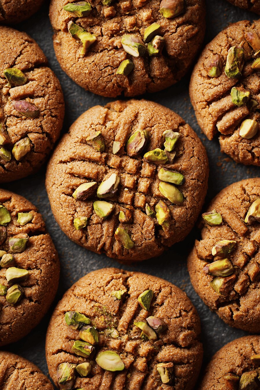 Dense peanut butter cookies with a nutty crunch. Uses oat flour and almond butter instead of all-purpose flour and peanut butter. Brown sugar swapped for coconut sugar brings a deeper caramel note. Chopped pistachios for texture. Cream and blend fats thoroughly to trap air, essential for lift. Watch the dough consistency; too dry means more fat needed. Bake until edges shimmer golden and centers firm but soft. Cool on wire rack to set textures fully. Adaptable, allergy-friendly, swaps keep chew while adding twist.