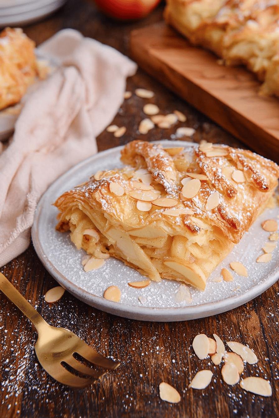Work on a clean, dry surface; dust with flour sparingly or not at all to prevent soggy dough. Cuts down sides must be equal width, spaced evenly — a ruler can help but eyeball is fine if consistent. Spread the cheese mixture thick enough to avoid dry patches but not so much it runs off sides. Apple filling should be thick; if watery, strain before using. Braiding technique traps steam and layers — don’t rush; fold gently but firmly. A shaky braid leads to leakage and uneven cooking. Egg wash is your ally — coat all exposed dough so it browns to a rich golden color, not pale or burnt. Almonds pressed lightly to adhere before the egg fully dries for even toast. Watch the oven rather than clock; puff pastry changes fast near done stage. Listen for faint hisses, watch puff rise sharply, edges turn shiny and golden. Bottom should sound hollow if tapped with spoon. Let rest briefly after baking to set layers. Cutting too soon risks filling spill; waiting firm up a bit for cleaner slices. Clean up is easier with parchment lined tray; sticky sugar residue peels off. Alternate fillings like pear or cherry add variety, adjust sugar accordingly to avoid overly sweet or dry outcomes.