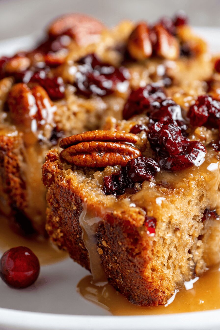 Apples chopped and pecans cracked, mixed with flour and warmed spice. Brown sugar swapped for part maple syrup, brings earthy sweetness beyond usual. Toasty nuts folded in. Dried cranberries swapped in for extra tart punch—fruit surprise. Batter thick, speckled with fruit and nuts. Glaze not just drizzle but spread thick, sticky. Baked until golden with a slight crust but dense and soft inside. Maple, butter, lemon glaze binds it all. Minimal fuss. Waiting for it to cool is hardest part. Makes breakfast something else or snack that’s not ordinary.