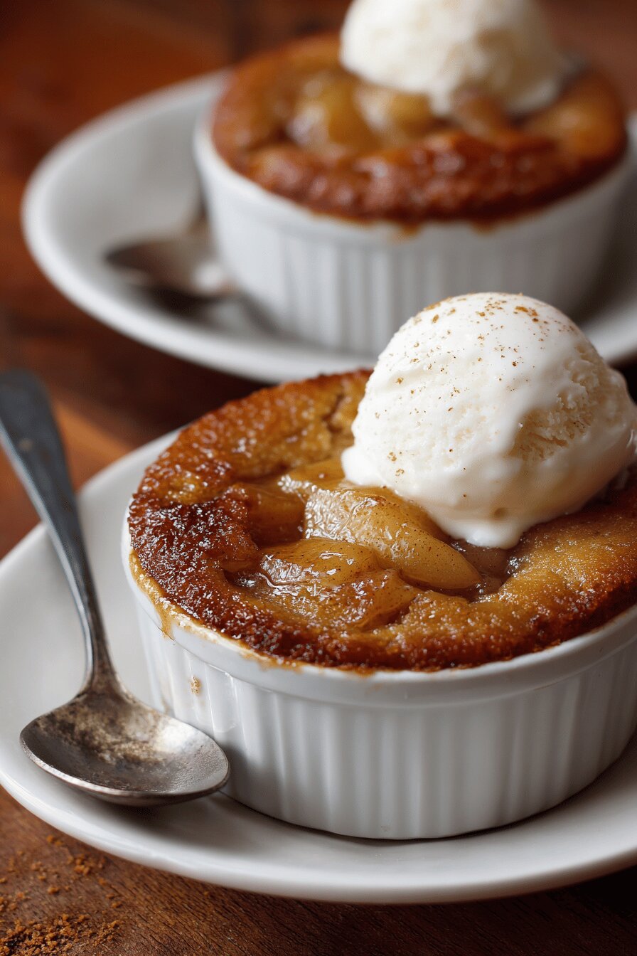 Small apple puddings baked in individual ramekins using an air fryer; fruit stewed first, topped with a quick cake batter. Uses gala apples for sweetness, agave syrup instead of brown sugar, and oat flour for texture. Modified baking times and ingredient amounts to suit air fryer capacities. A warm, slightly rustic dessert, served with cinnamon ice cream or whipped cream for contrast. Highlights controlled caramelization of apples and tender crumb on top. Efficient, compact method to get a comforting dessert with minimal cleanup.