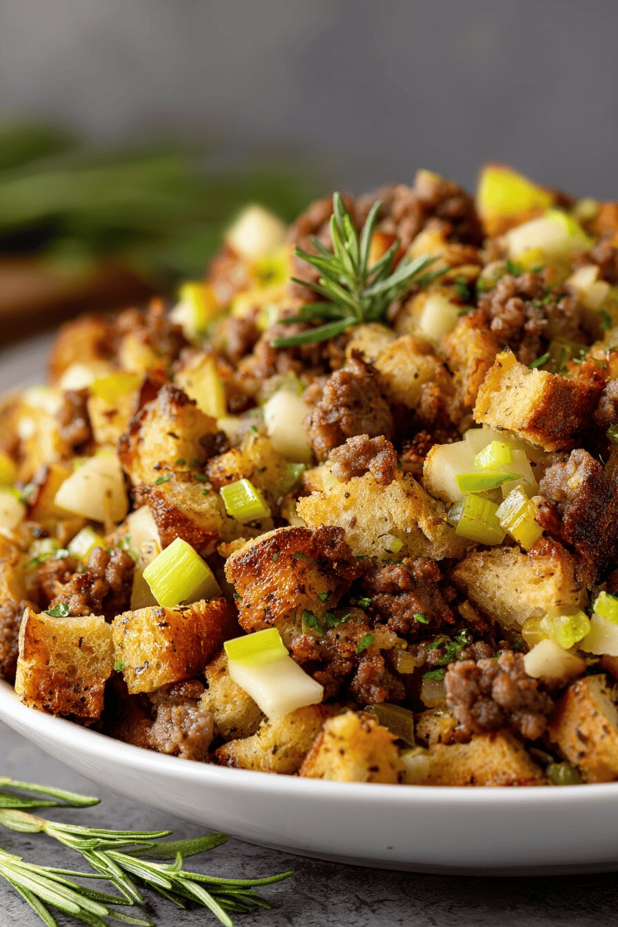 Sausage and apples mingle with crisp bacon and celery in a rustic bread stuffing. Aromatics build layers; mustard and cinnamon give subtle warmth. Moist but slightly crisped top from broiling. Uses stale sourdough cubes for texture contrast. Practical substitutions included for bacon and apples. Teaches doneness cues beyond a timer, focusing on aromas and texture notes.