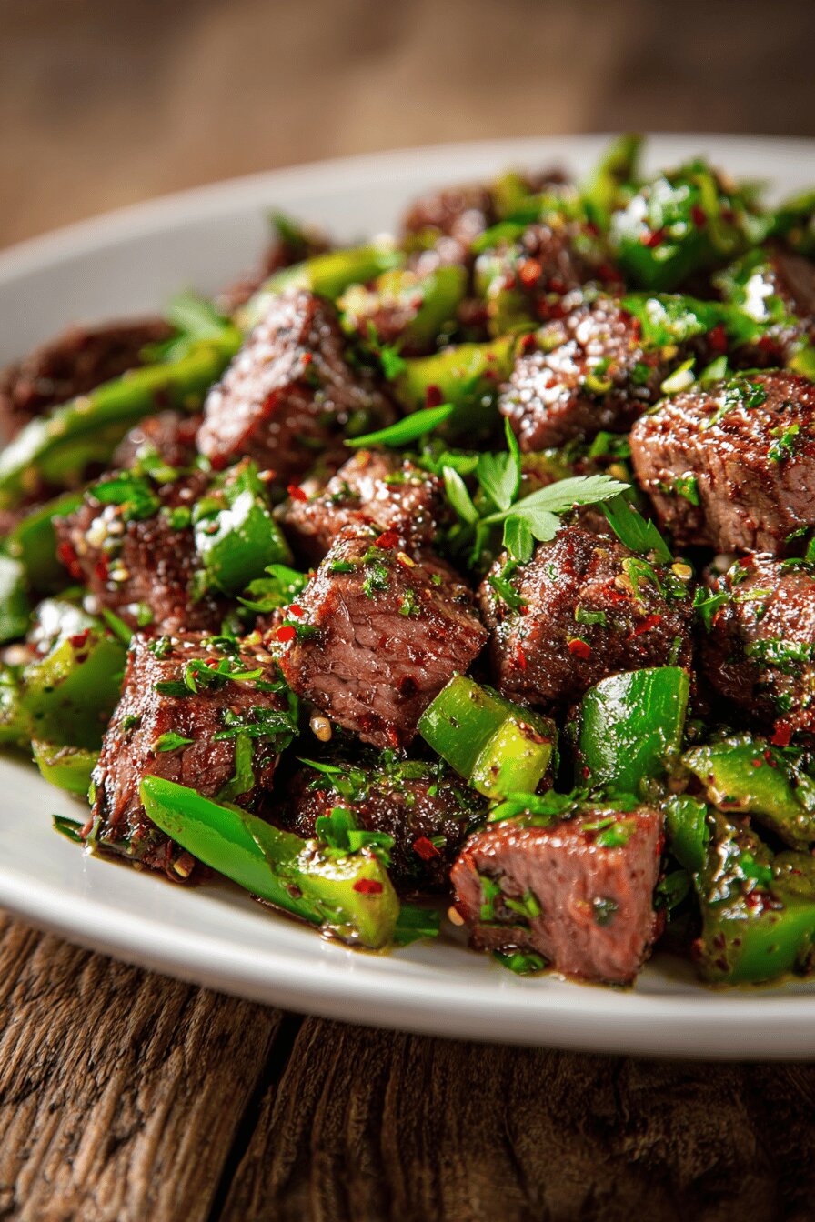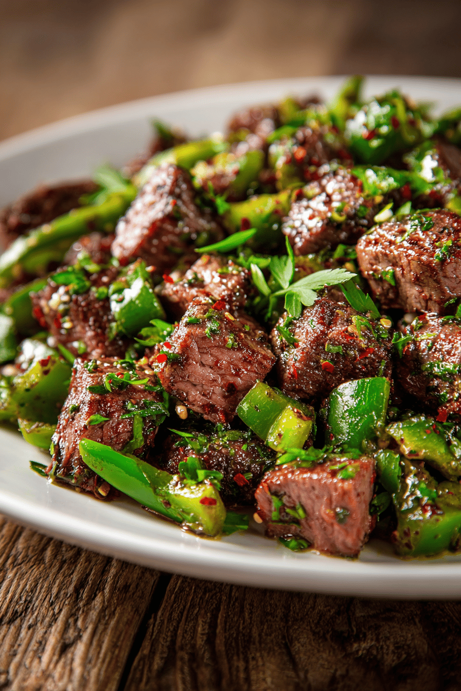 A grilled beef hampe marinated with green pepper, garlic, and red wine vinegar, spiced with oregano and chili flakes. Modified quantities and steps for better flavor balance. Added smoked paprika and fresh thyme for depth. Marinated longer for tender bite. Cooked over direct high heat, spices sprinkled mid-grill to avoid burning. Rested briefly before cubing for finger-friendly serving with toothpicks. Substitutions include sherry vinegar and crushed red pepper. Technique focuses on sensory cues not just timers, addressing common mistakes like drying out or under-seasoning.