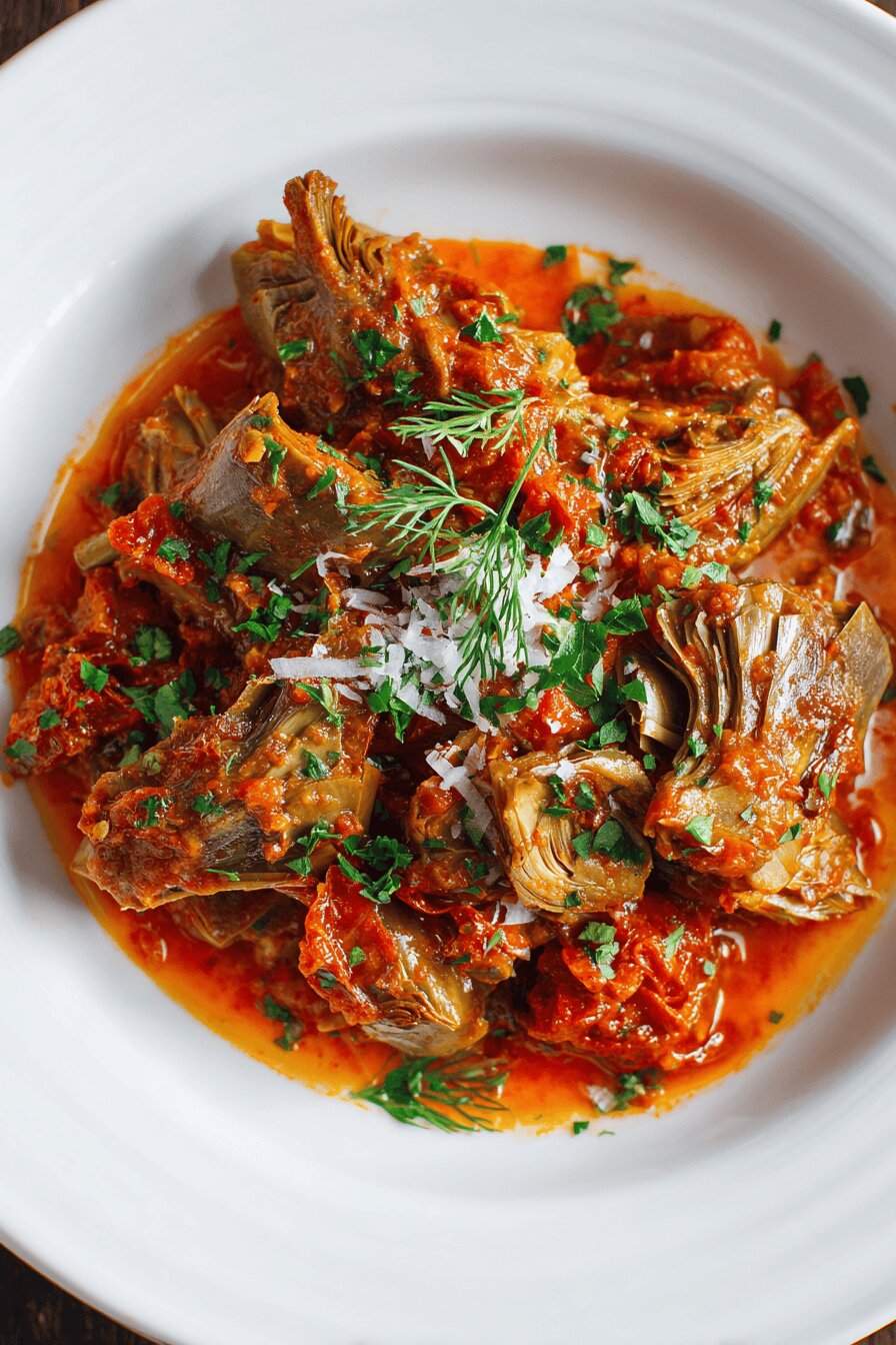 Steam-tender artichokes nestled in a tangy tomato sauce base with a mayo twist. Garlic and onion base savory enough to elevate simple ingredients. White wine adds depth; lemon keeps brightness. Swap mayo for Greek yogurt, tomatoes for sun-dried for varied texture and richer umami. Watch for artichoke softness not strictly by time but by leaf pull and stem tenderness. Sauce thickens to rich coating consistency with slow tomato cooking and gentle wine simmer. Ends chilled or slightly warm; versatile for spring or fall. No gluten, dairy-free options with easy ingredient swaps. Sauce is creamy, slightly acidic, and aromatic. Balanced simplicity and technique-packed.