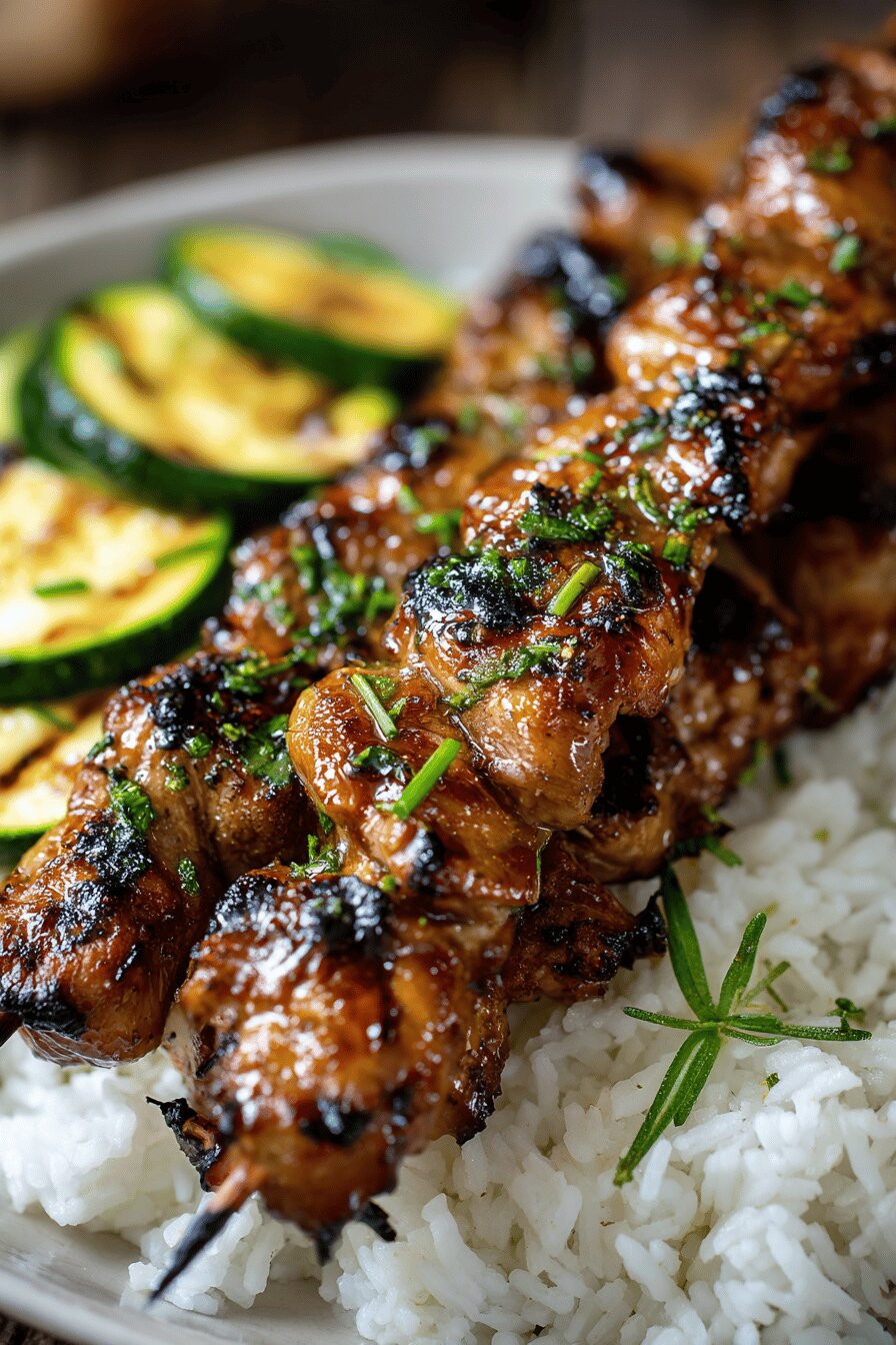 Marinate chicken no longer than 3-4 hours to avoid over-tenderizing. Coating all morsels thoroughly crucial to flavor soak. Thread chicken loosely on skewers allowing heat circulation. Grill preheated to high for proper searing and caramelization. Cook 4-5 minutes a side, monitoring to avoid drying out. Flip gently once for even cook. Adjust timing by thickness of chicken strips. Let rest a minute after grilling. Serve hot, paired with simple sides like grilled zucchinis for crunch and steamed rice to soak juices. Can brush extra marinade during grilling but beware sugar burn. Use tongs not forks to keep chicken moist. No sauce added after grilling to maintain crisp edges.