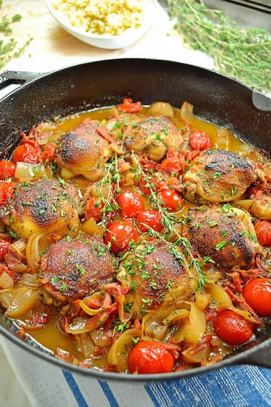 Browning skin-on thighs in hot oil until crackling crisp sets the stage. You hear that faint pop, smell the rendered fat fill the kitchen. Pancetta dropped in the same pan crisps quietly, leaving behind a smoky, oily base primed for caramelized shallots. Patient stirring, coaxing color out over medium-low heat; don’t rush or burn. A splash of white wine pulls browned bits free, adding tang. Dijon and rosemary stir flavor into liquid gold. Covered and oven-braised until the thermometer hits safe temp. Butter-house slurry—beurre manié—whisked in creates a glossy sauce without lumps, thick enough to coat skin but smooth enough to spoon. Tossed cherry tomatoes warm through without mushing, lending freshness. Ready over rice or pasta, scattered with chives. Real ingredients, practiced technique, no shortcuts needed.