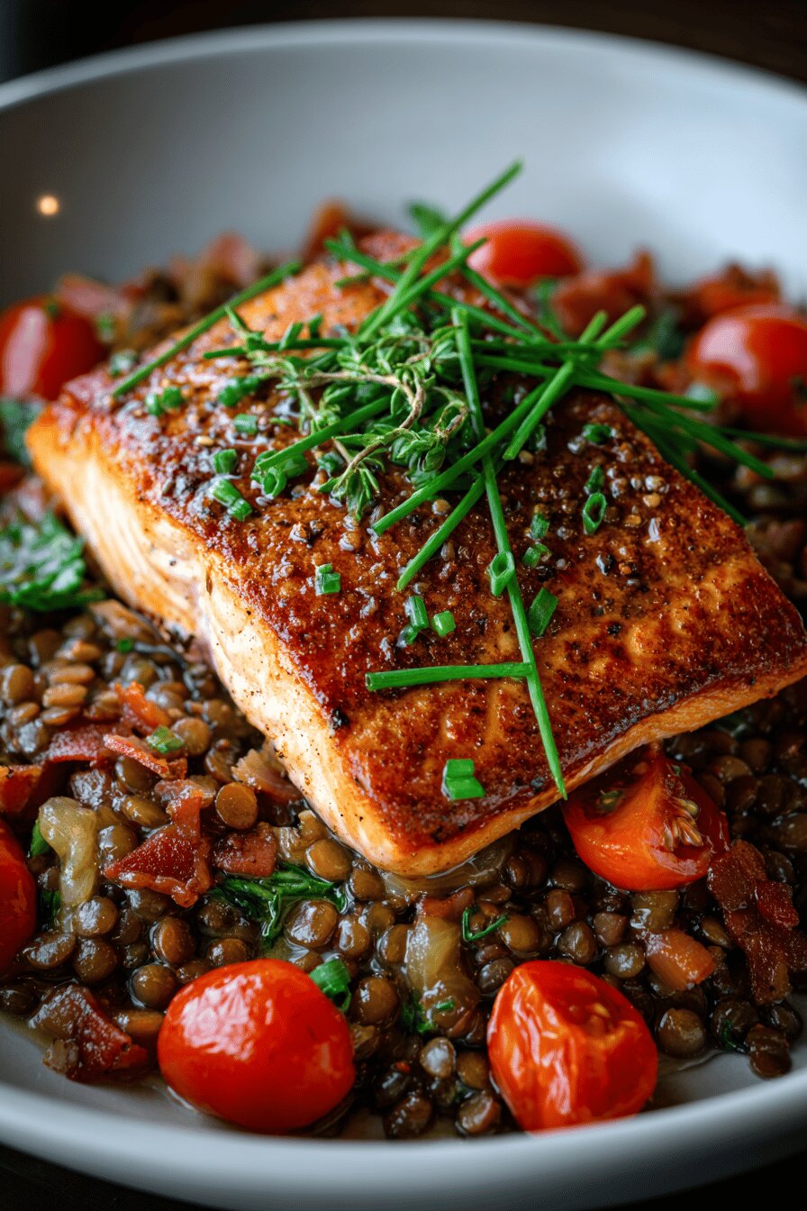 Lentils require a gentle simmer to avoid breaking apart. Beware over boiling – adds starch cloudiness and mush. The pancetta fat renders slowly; if you rush, the lardons remain tough. Use visual cues: shallots are done when translucent, garlic fragrant but not browned, a sign of bitterness. Vinegar and mustard induce emulsification—take care to stir well after adding liquids but do not boil hard to keep texture. Salmon needs to sizzle, not steam; heat your pan properly and avoid overcrowding. If fish sticks, the pan isn’t hot enough or fish too wet. Balsamic reduction thickens when it coats the back of a spoon; watch carefully to prevent caramelizing to burnt. Spoon glaze over fish repeatedly for a shiny coat. Rest fish briefly; juices settle, flesh firms to perfect flake. Serve hot, no lingering plate time to prevent sauce drying.