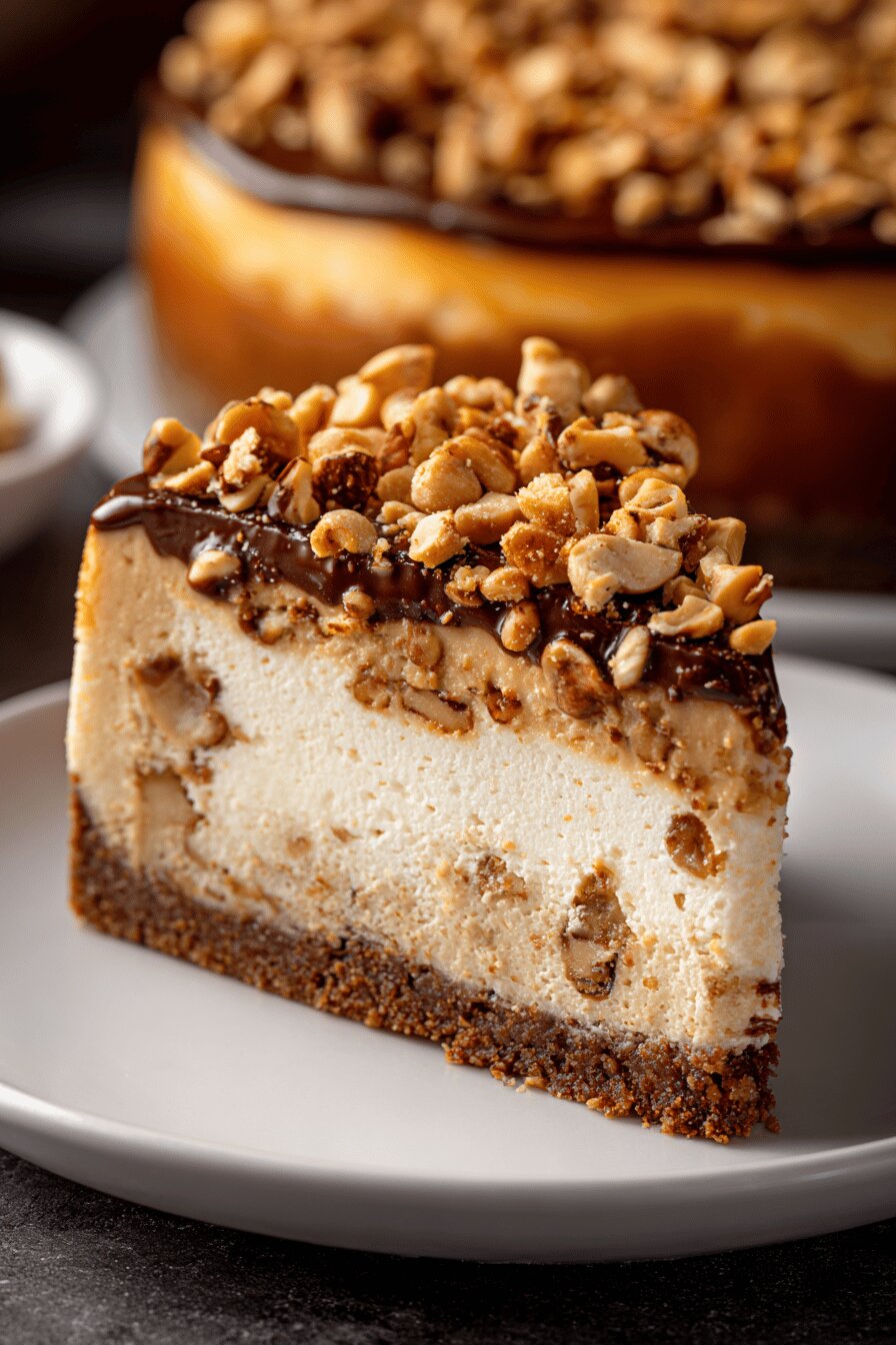 - 💡 Chill cheesecake overnight. Tightly wrap if storing. Allows flavors to set well. The cake needs at least seven hours. Don't skip this step. Run a knife along edges before removing. Prevents tearing layers. Fruit and nut layers visible. Crisp peanut topping needs to stay crunchy. Always slice with a wet knife. Keeps edges clean. Supports presentation. Store leftovers in fridge. No longer than three days.