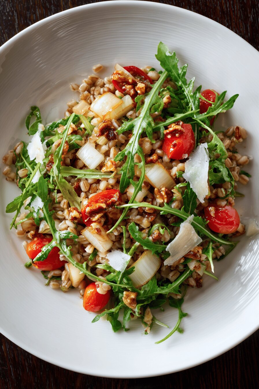A robust barley salad with caramelized shallots, crunchy celery, and fresh cherry tomatoes. Tossed with tangy preserved lemon and peppery arugula, finished with toasted walnuts and aged Pecorino. Earthy, bright, and textured. Simple layering of flavors; each bite a balance of soft grains, crisp veggies, and savory cheese. Perfect for warm days or as a make-ahead lunch. Highlighting fundamental skills: properly cooking barley al dente, getting the caramelization right on shallots, and balancing acidity with preserved lemon. Substitutions included for nuts, greens, and cheese. Focus on tactile and visual cues over timers.