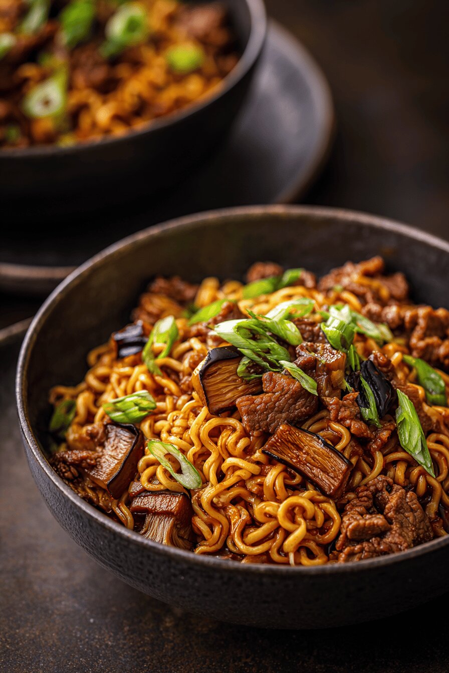 Ramen noodles tossed in a spicy-sweet blend of tamari and black bean garlic sauce. Sautéed diced Japanese eggplants and thick-cut king oyster mushrooms for texture contrast. Lean ground beef browned with smoked paprika and fresh ginger. The sauce thickens with arrowroot for clarity. Garnished with scallions. Balanced savory, smoky, umami flavors with a punch of heat. Quick cooling rinse after noodle boil to stop cooking. Adaptable to shiitakes or cremini mushrooms. Great for weeknight dinners or meal prep. Dairy, nut, egg free. Less salt because of tamari use instead of soy. Minutes and steps adjusted for better caramelization.
