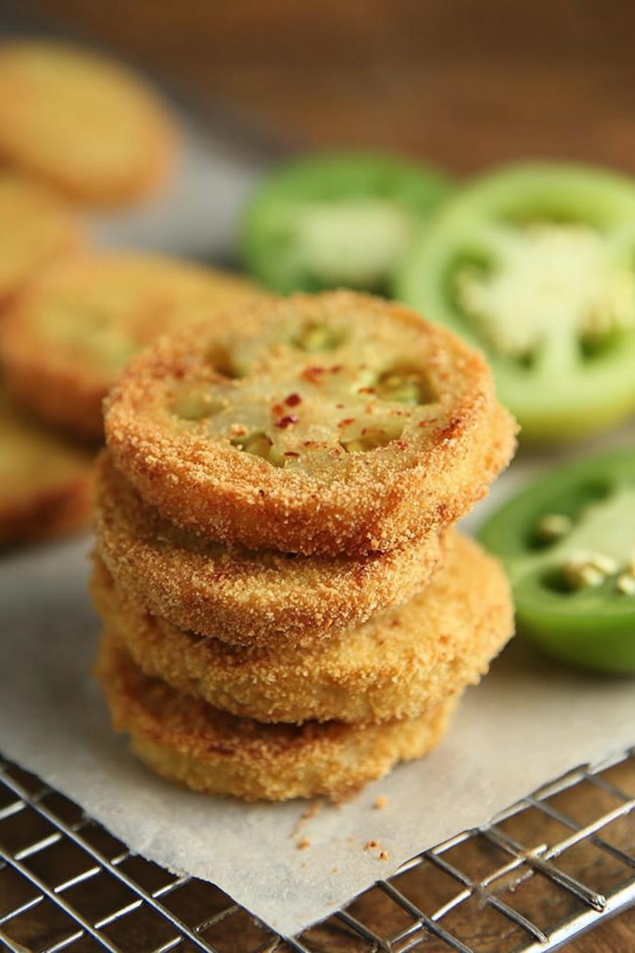 Spotted those green tomatoes just sitting? Slice ’em thin but not paper-thin—3 to 5 mm thick slices hold up best. Paper towels absorb moisture, a must. You want crunch, not mush. Crush spicy chips with polenta for an elevated crunch and a bit of heat. Swap beer for cider—lighter, slightly fruity. Coating’s a three-step dance: flour to grab, wet bath to bind, then chip-polenta clutch. Oil temp crucial. Too hot? Burnt edges, raw middle. Too cold? Grease soak. The hiss tells you mid-fry. Don’t crowd pan; they steam instead of crisp. Flip once, gently. Drain elevated to avoid soggy bottom—no plating right from pan. Salt as they come out, not before. These are built for crunch, inside and out.