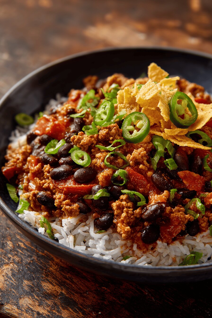 Hearty chili, swapped pork for turkey, replaced white beans with black beans, added a pinch cinnamon. Slow simmer lets flavors meld into thick, saucy richness. A smoky aroma fills the kitchen, aroma sharpens as the beer hits the pan. The meat browns to deep caramel, spices toast releasing a warm earthiness. Subtle bitterness from beer balances the slight sweetness from cinnamon and cocoa powder. Serve over rice or crunchy nachos. Adaptable to what’s on hand. No heavy cream, no dairy. Gluten free naturally. Use ground turkey for lighter, black beans for richer bite. Cinnamon adds subtle warmth without being obvious.