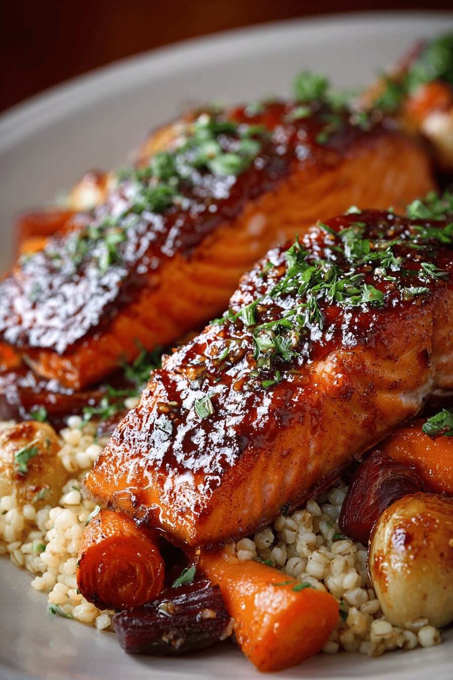 Heat and stir glaze ingredients, watch carefully to avoid burning. Simmer until thick—thickness cues: slow drip from spoon, syrupy but pourable at room temp. Cool fully then chill, the glaze firms and thickens for better coating. Broiler placement crucial — too close, burns glaze; too far, no caramelization. Oiled baking dish prevents sticking, supports even cook. Brush glaze generously before broiling and optionally after — glossy finish, concentrated flavor. Cooking time shifts ±1-2 minutes depending on filet thickness. Salmon is done when it flakes easily but still moist inside, bright pink. Let rest briefly before serving so glaze sets, flavors meld. Barley pilaf cooked separately, paired with slow-roasted root veg to keep plate rustic. Don’t overbrush glaze during cook, might drip or burn.