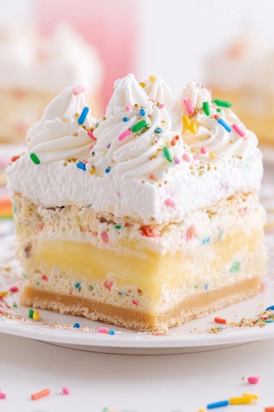Layers of crushed cookies, tangy cream cheese mix, thick pudding, and whipped topping. Uses vanilla sandwich cookies crushed fine, melted butter to bind. Cream cheese beaten well with powdered sugar and frozen topping for fluffy base. Sprinkles add color, stirred gently not crushed. Pudding mix thickens quickly when whisked with milk and frozen topping, spread carefully over cream layer. Final touch whipped topping spread with spoon, swoops made visually inviting. Chill several times, layers must be cold for clean cuts and texture contrast. A few ingredient swaps tweak flavor and texture subtly. Make a visual colorful party treat with simple tools and patience.