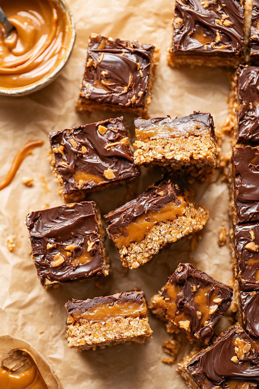 Sticky, sweet, crunchy layers. Biscoff adds spice, depth, complexity you don’t get from plain peanut butter. Honey and brown sugar fuse into caramel notes with nuance thanks to molasses swap. Coconut oil lends richness to chocolate topping, melts more gently than veg oil. Textural interplay between gooey caramel-coated cereal and firm, glossy chocolate matters—don’t rush pressing or chilling steps. Salt pops flavors amid sugary layers. Work fast with hot syrup and warm cookie butter or risk clumpy, dry mess. Watch and listen for bubbling textures and melting cues. These bars demand respect but pay off. Variations to consider if pantry limited or add crunch with nuts or toasty grains. Remember, temperature and timing trump timers—feel, smell, sight your way through key steps.