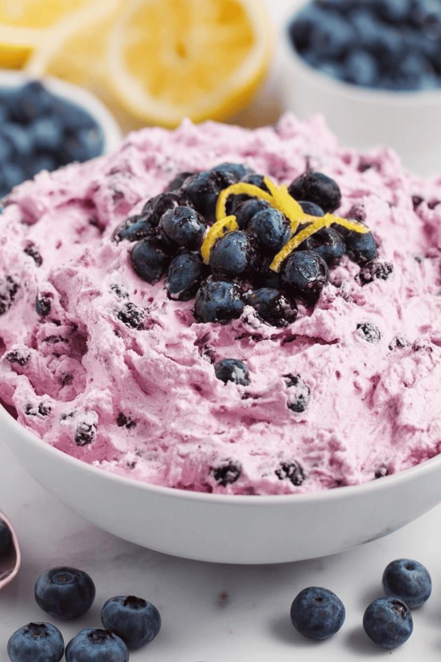 A chilled dessert folding fresh blueberries with a creamy blend of softened cheese and whipped topping, sweetened and brightened by citrus and vanilla. Integrates fresh blueberry pie filling for added sweetness and texture. Requires gentle folding to keep blueberries intact and fluffy texture intact. Chill for flavor melding and firming up. High sugar and fat content, suitable for occasional indulgence. Simple prep, no baking needed.