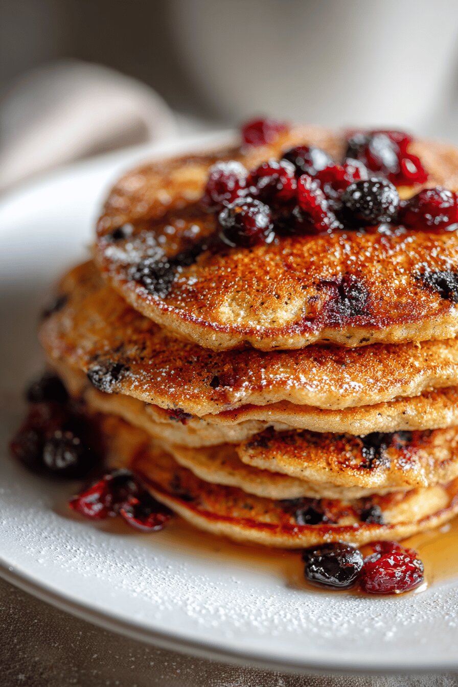 Dry pancake base with dried berries, not your typical flour and sugar. Almond flour inclusion cuts starchy chew, adds subtle nuttiness without nuts or lactose, easy on digestion too. Coconut sugar replaces white; less processed and holds moisture. Acid-base mix switched from baking powder to cream of tartar plus baking soda; fresher rise, tang hint. Uses dried cranberries over blueberries — punchier flavor, less mush. Mix to store, use when hungry. Hydrate on demand avoids lumping, controls batter texture. Watch bubbles, edges crisping—look for that telltale flick flip sound—pancakes that cook through yet stay moist inside. Keeps vegan, nut allergy swaps by subbing oat flour if needed. Season salt down to highlight berry tartness without overwhelming batter. No eggs, no milk, but rises. Kitchen-tested and ready.