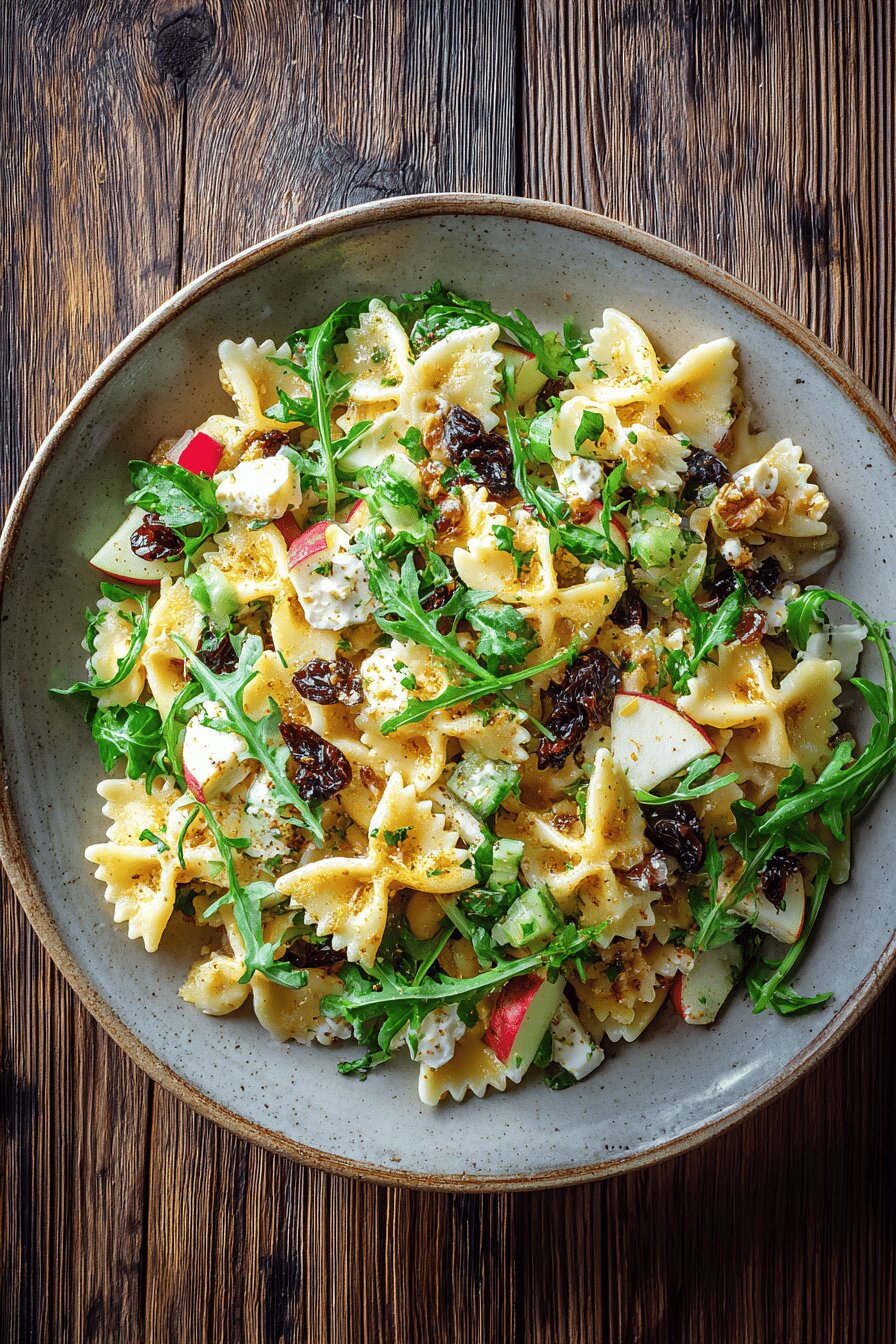 A crisp, colorful salad with al dente bowtie pasta, diced apples, tangy dried cranberries, and creamy feta. Red onions softened in lemon juice and olive oil add subtle sweetness. Peppery arugula offers a fresh green crunch. Simple lemon and olive oil dressing coats all ingredients evenly for balanced flavor. Light, vegetarian, no nuts or eggs. Great for picnics or light meals.