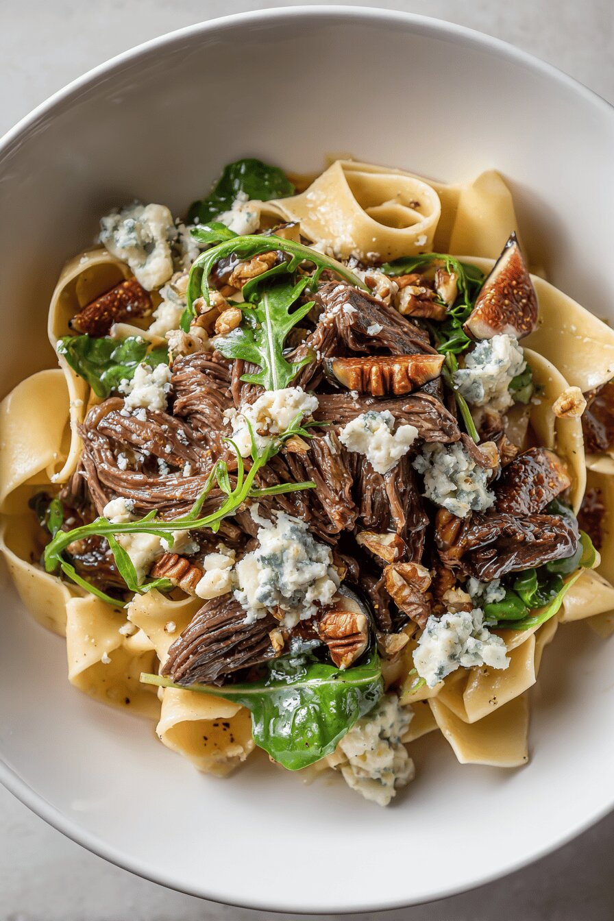 Chunks of chuck, browned well to lock in juices. Butter sizzles, browning meat until deep mahogany crust forms—don’t rush this step. Shallots soften, translucent, releasing sweet aroma. Garlic added only briefly—burnt garlic ruins sauce. Deglaze with dry sherry instead of sweet porto. Bubbly reduction sharpens flavor. Figs swap for dates—less sticky, subtler sweetness. Simmer low and slow; hear gentle simmering, see meat become tender, fibers pulling apart softly at poke. Wide pappardelle swirls that fork can twirl around. Toss pasta off heat, butter cold—melts slowly, making sauce silky, not greasy. Baby arugula bitter green, fresh snap amid rich meat. Blue cheese crumbles tart and sharp, touch of funk. Toasted pecans crunch, contrast texture. Watch color, listen for sounds. Timing flexible; use senses. Pasta water to loosen sauce, always a hideout trick. Classic rustic, with tweaks. Practical tips for home cook, not fussed chef only.