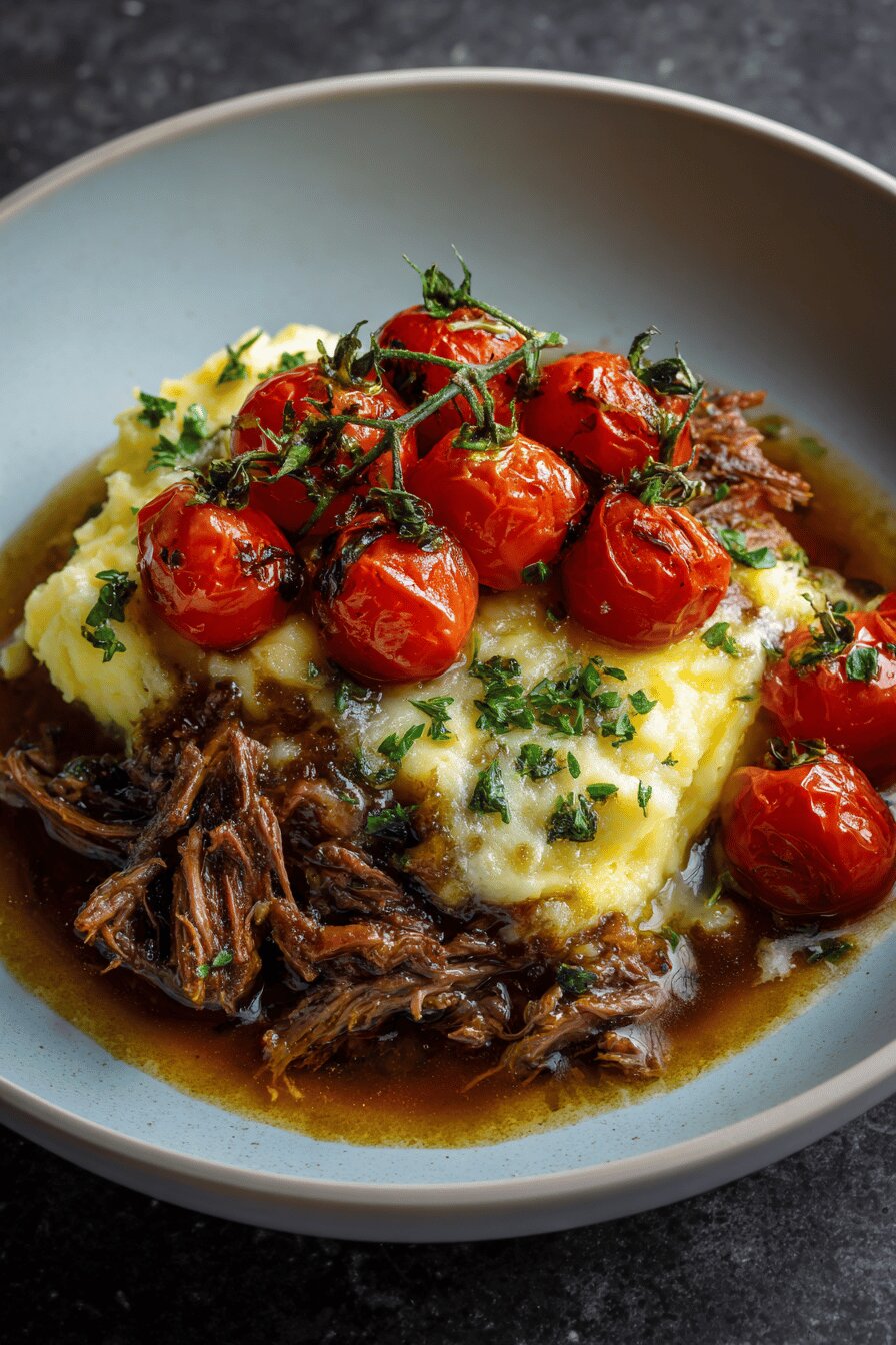 A slow-cooked beef shoulder roast braised in wine and homemade stock, shredded and baked under a garlicky potato mash with melted Oka cheese. Finished with spiced maple-glazed cherry tomatoes for a sharp contrast. Layers of bold umami, creamy textures, and vibrant bursts from the confit tomatoes offer a rustic yet refined dish. Technique-driven, precise reductions, efficient braising, and griddled cheese topping ensure a hearty meal free from gluten, nuts, and eggs.