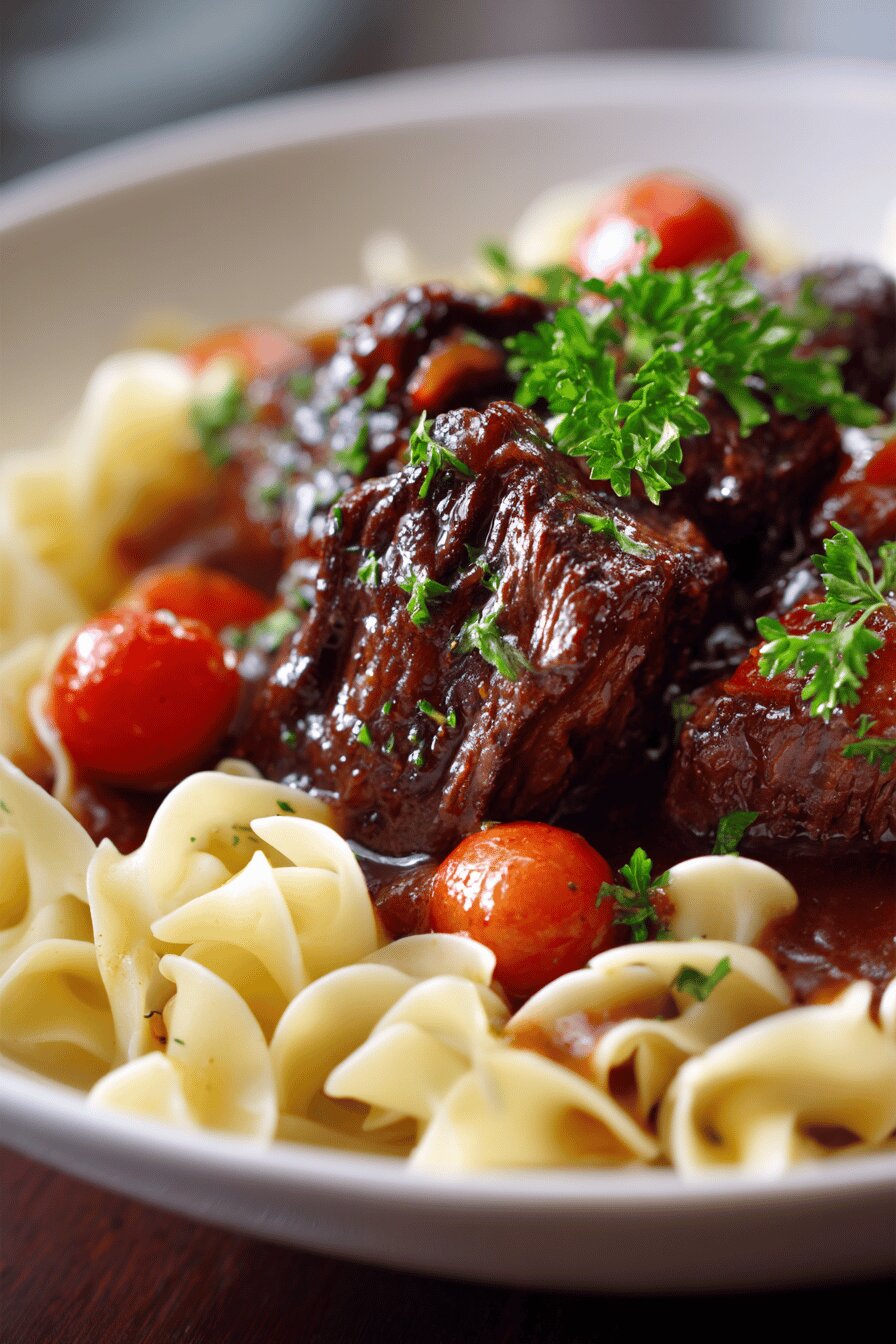 Slow-braised beef shoulder roast cooked in red wine, vinegar, and crushed tomatoes. Aromatics softened before simmering. Oven cooking low and slow till fork-tender meat. Finished with parsley, served over noodles or baby potatoes. Substitutions for wine and herbs suggested. Techniques emphasize browning, deglazing, and moisture control. A practical approach to classic French-inspired comfort food. No nuts, dairy, gluten, or eggs.
