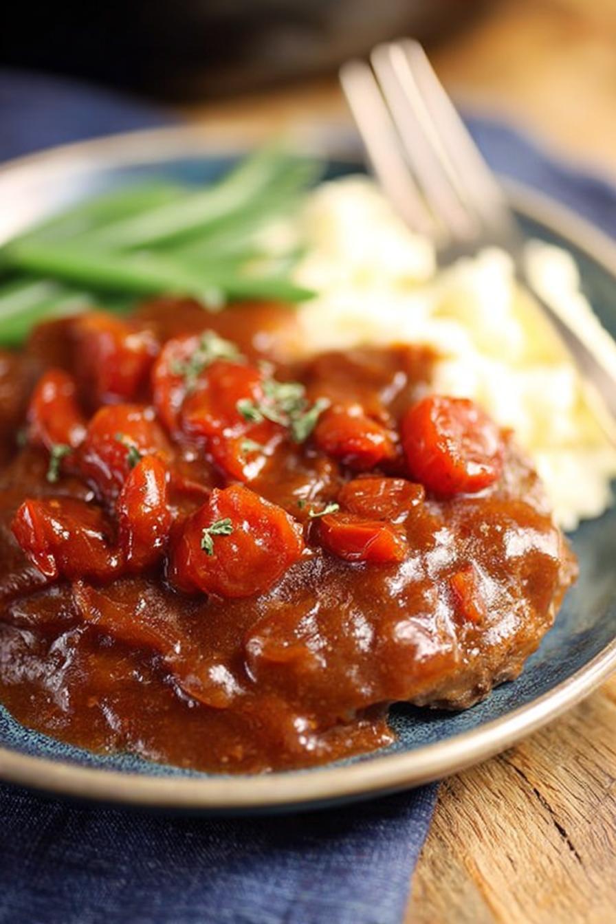 Searing is critical; don’t rush. Oil hot enough when you hear immediate crackle on contact. Layer seasoning well and dredge properly to avoid clumps. Removing steaks after crust prevents steaming that ruins texture. Deglazing with broth loosens all the browned goodness locked in pan—scrape thoroughly. Adding mushroom soup replaces gravy packet; it thickens sauce naturally and imparts richness. Fire-roasted tomatoes should be stirred in gently to preserve chunks and smoky flavor. Simmering with tight lid traps moisture for tenderizing tough muscle fibers; avoid boiling or harsh heat that toughen meat. Stirring during simmer is unnecessary, even disruptive; only check midway to confirm doneness. Adjust thickness at end by uncovering sauce; add a pinch of cayenne or black pepper if needed for brightness. A final rest 5 minutes uncovered lets sauce settle and flavors marry before serving.