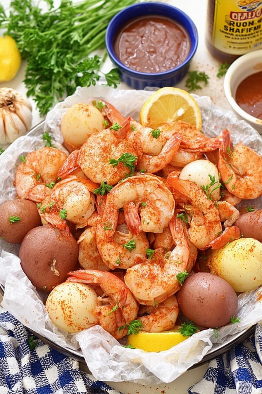 Shrimp and potatoes steamed together with beer, garlic, and spices. Potatoes cooked until tender but not mushy; shrimp added last to avoid overcooking. Onions bring sweetness while lemon wedges brighten the plate. A splash of soy sauce replaces traditional seasoning. Garlic intensity tamed by simmering in beer — adds complexity without bitterness. Timing adjusted slightly for texture balance. Focus on visual cues — potatoes poke-soft, shrimp pink and curling. Aromas shift from malty beer to briny seafood as it cooks. Practical tips on swapping beer for cider or broth; fixing rubbery shrimp; avoiding potato meltdown.