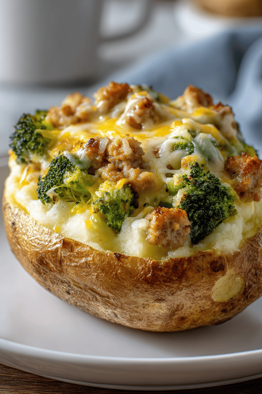 Large red or Russet potatoes baked then hollowed. Filling blends tender broccoli florets with browned Italian sausage, sharp cheddar, and creamy butter-milk mash. Quick steam for broccoli locks color and crunch, then chilled fast. Sausage pan-fried for deep caramelization. Baking finishes with cheese melted and browned. Balanced texture: soft potato shell with savory, slightly crisp topping. Sub potato with Yukon gold for more buttery taste. Swap sausage for chorizo for smoky heat or use turkey sausage for leaner dish. Milk can be almond or oat for dairy-free, butter replaced with olive oil tied into sausage fat. Keep potato walls 1/4 inch thick to hold stuffing without breaking. Crisp base by trimming potato bottoms avoids wobble in oven. Look for bubbling cheese and slight browning to know done. Serves 4 hungry eaters.