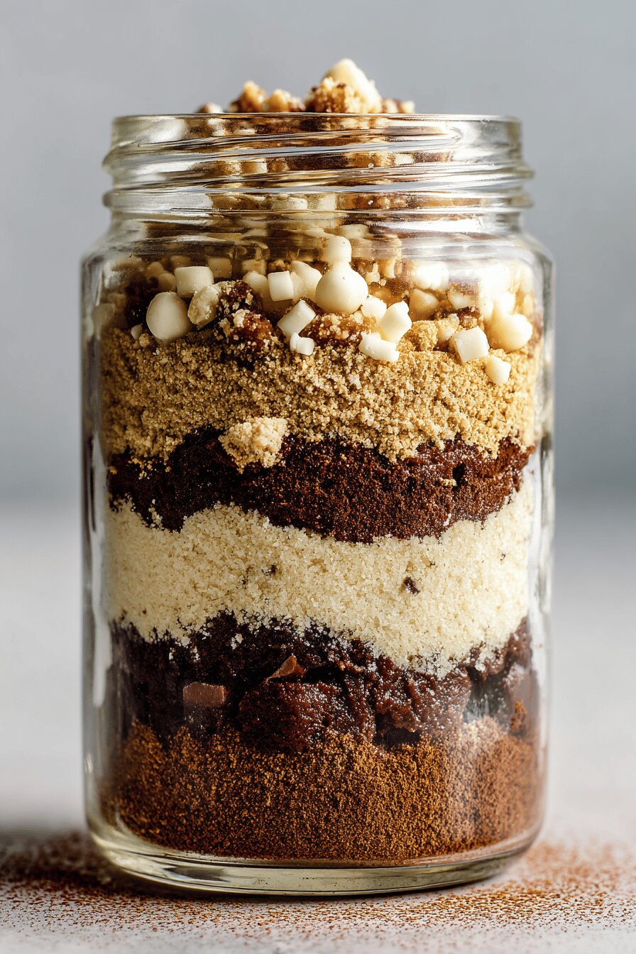 Flour sifted to avoid lumps. Salt for balance. Carob powder lower bitterness than cocoa, sweeter tone. Coconut sugar lends caramel notes, better moisture retention. Brown sugar for deep molasses undertones. White chocolate chips melt different than dark, sweeter contrast. Ground flaxseed acts like egg, binds while vegan friendly. Espresso powder optional but heightens flavor complexity. Package in 700 ml jar for compactness. Keep sugar layers separate from flour to prevent clumping. Label jar clearly, gift instructions included.