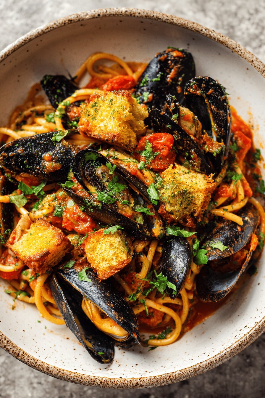 Garlic should be freshly minced, not powdered, to retain punch without bitterness. Red pepper flakes adjusted to taste but add that faint heat that lifts seafood’s sweetness. White wine must be dry and decent quality, but if unavailable, a squeeze of lemon and a splash of broth replaces acidity. Tomatoes canned whole for better texture; crushed for smooth sauces only. Mussels you’ll need did-clean and debeard thoroughly—that gritty sand ruins experience. Bucatini preferred because it traps sauce internally, but fettuccine works fine. Crisp bread must be thoroughly dried then golden fried with fresh herbs — dried herbs dull the flavor. Parsley swaps nicely with cerfeuil for availability and sharp freshness. Store-bought bread is fine but avoid very soft loaves — they won’t crisp properly.