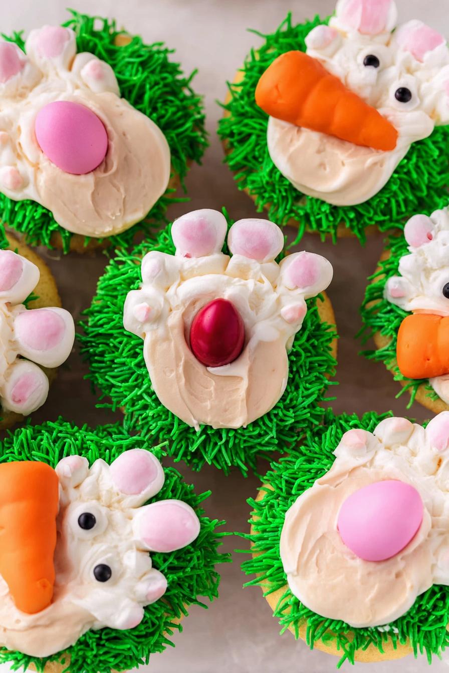Cupcakes done the fun way—channels eyes, hands, and little fingers. Start with a trusty cake mix, scaled here to 18 cupcakes instead of 24 to avoid waste. Cooling crucial. Hot cupcakes plus frosting? Slip and slide disaster. Task: replicate bunny feet with candy halves pressed just right. The figure 8 shape? Visual clue that halves work. Black piped dots for foot pads give dimension and detail. Pink-star frosting tails? Textured with fork tines for character, not flat blobs. Grass with mixed piping tips adds that wild patch look, messy but intentional. Jelly beans scattered in as faux Easter eggs. Layout on platter—bunnies nose down, tails up. Keep frosting chilled if it warms. Eat soon or risk sugar hum.