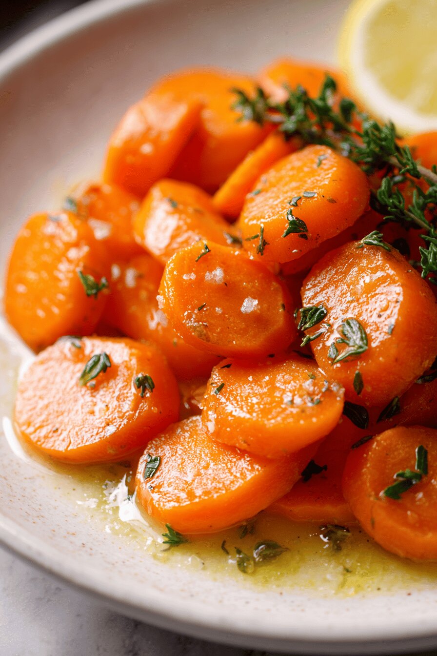Start with boiling salted water, important for properly seasoned root veg. Carrots dropped in shimmer crunch slowly yielding to tender texture. Cook time: about 12 minutes; slightly less for crunchier, slightly more for softer depending on carrot size. Drain quickly to stop cooking. While hot, toss with softened butter—heat makes butter melt gently coating each round. Fresh thyme leaves added last to avoid overcooking and flavor loss. Lemon juice stirred through after heat to preserve brightness. Season with salt and black pepper at final step; salt in water impacts flavor but finishing salt allows control. Serve warm on platter or covered bowl to keep temperature. Store briefly if needed; rewarm gently. Avoid overheating butter on reheat to maintain texture. Simple; no fancy equipment.