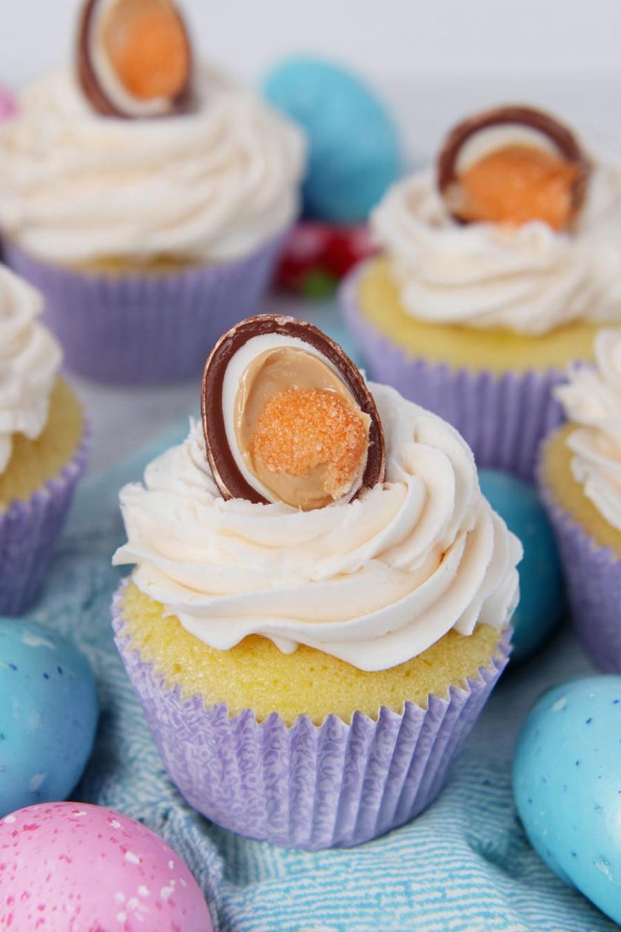 Frozen Cadbury eggs encased in cake batter, baked till golden, topped with buttercream swirled with creamy filling, crowned with egg halves. The center stays soft, moist but not soggy. Use large liners to hold size. Frosting gets a flavor punch from real creme, not just sugar. Frost and top right after cooling. Baking cues? Look for springs back tops, light browning. Toothpick test fails here, batter surrounds a solid egg. Chill eggs beforehand to avoid melting inside and help distribution. Add espresso powder to batter; intensifies chocolate undertones. Swap shortening for cream cheese in frosting for tangy richness. Avoid overmixing creme or frosting thins out. Watch oven closely; oversized cupcakes bake faster inside.
