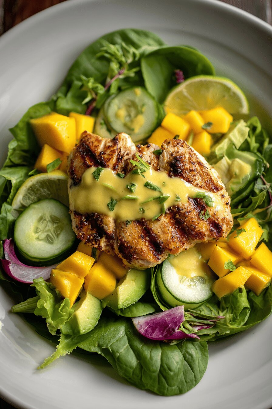 Vinaigrette blending is key: pulse to retain small mango pieces, adding texture contrast; over-blending turns it too watery. Chicken doneness isn’t about minutes, but firmness — slight bounce indicates juiciness retained. Searing chicken develops Maillard crust; listen for steady sizzle, adjust heat to medium to avoid burning. Dry greens thoroughly to prevent dressing dilution and swift sogginess. Tear lettuce by hand for natural texture edges; knife cuts cause oxidation and browning. Assemble salad just prior to serving to keep colors vivid. Layering avocado between chicken and mango protects against oxidation while enhancing texture from creamy to chewy to juicy. Don’t drown salad under vinaigrette; the point is a light glaze. Toast nuts over medium heat, stir constantly—aroma and color changes signal readiness, not a timer. Keep nuts moving to avoid bitterness. Chill plates if ambient temperature is over 24°C to preserve crispness longer.