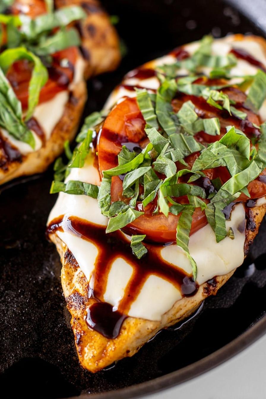 Always discard marinade after chicken is removed to avoid food safety risks. Shaking excess marinade off ensures grilling without flare-ups or steaming. Oil grill grates well to prevent chicken sticking; use paper towel dipped in oil and tongs to rub grates before heating. Indirect heat prevents overcharring before interior cooks. Several thickness-dependent checks during grilling prevent drying: use thermometer or visual cues like firm texture and clear juices. Rest chicken post-cooking for even juice distribution and easier slicing. Melting cheese on residual heat or with closed grill/oven is the gentlest approach to avoid burning cheese before chicken is done. Balsamic glaze should be drizzled cold on plated chicken to avoid too much evaporated acidity. Adjust oven time slightly based on chicken size and pan material. Crowding pan traps moisture and causes steaming rather than roasting, resulting in rubbery textures. Final seasoning with fresh pepper and salty cheese rounds out flavors just before serving.
