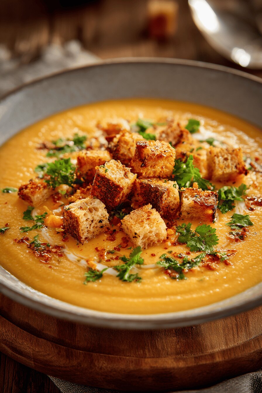 Leeks instead of onion for a milder start—cleaning out grit is key. Garlic minced fine for quick aroma lift but watch browning. Olive oil replaces butter here; higher smoke point, layers flavor differently. Sweet potato swapped in for starchy punch, slow melt, adds gentle sweetness and creamy texture. Turmeric joins curry powder, earthy warmth, gives golden hue that screams flavor without overcomplicating. Don’t rush the simmer; vegetables should soft-enough for effortless blending, but you don’t want mush. The soup’s body depends on the right balance of solids to liquids—too watery lacks presence; too thick feels heavy. Spices measured out but adjusted live in the bowl because powders vary by brand and age—the nose and palate know best. Toasted bread cubes yield textural counterpoints, soggy bread is dead weight—toast them deeply but carefully, so they’re crisp without burning. Dinner timing? Watch vegetable readiness, rely on feel not the clock. Serve piping hot, stir gently before pouring; you’ll smell fresh ginger and curry hitting the air, inviting and bold but restrained.
