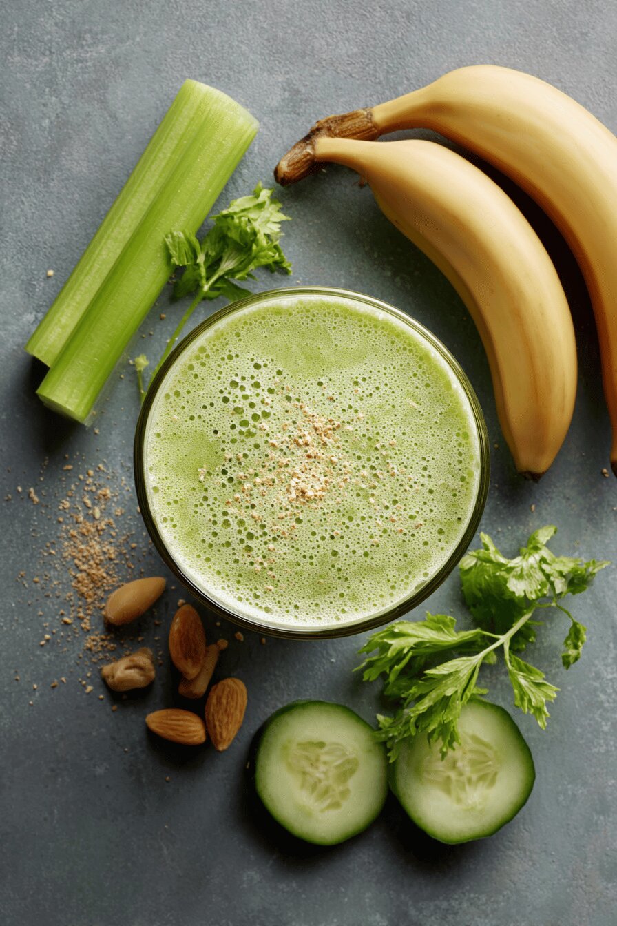 Green apple swapped with cucumber for freshness. Peanut butter replaced by tahini for richer nuttiness. Almond milk lowered by 50ml, added coconut water for lightness. Tripled celery quantity. Glaçons kept for chill but reduced. Blend until the texture shows no fibrous bits, about 4 to 7 minutes depending on blender power. Serve fast before separation. Works cold or room temp. Nut alternatives or seeds suggested for allergy swap. Smooth, fibrous. Substitutions for liquid and nut butter to keep balance. Tactile and visual cues guide timing more than clocks here.