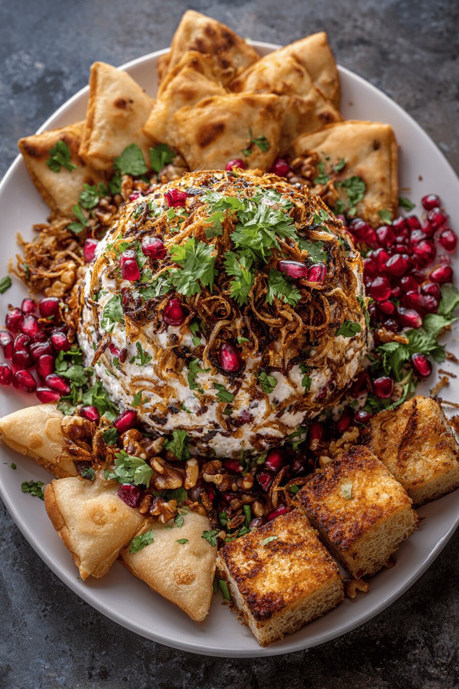 - Transfer cheese ball to small platter. Let sit at room temperature 15 minutes before serving; softens for easier spreading. Sprinkle pomegranate arils, fresh cilantro, fried shallots on top. Provide grilled pita chips or toasted baguette slices alongside. Keep leftovers tightly wrapped, refrigerated up to 3 days. Room temp before next serving improves flavor but keep brief.