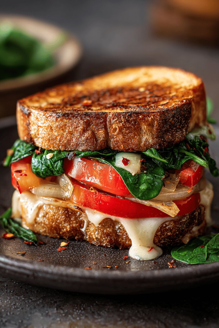 A vegetarian grilled cheese with slow-cooked onions and juicy tomato slices. Adjusted quantities with swapped ingredients: baby spinach instead of roquette, smoked gouda replacing cheddar, and mayonnaise for mustard to add creaminess. Onion cooking times shifted slightly plus a touch of crushed chili for bite. Buttered sourdough yields crunchier texture. Clear visual cues guide to caramelization and doneness. Practical tips cover soggy bread fixes, seasoning tweaks, and ingredient swaps for common pantry finds.