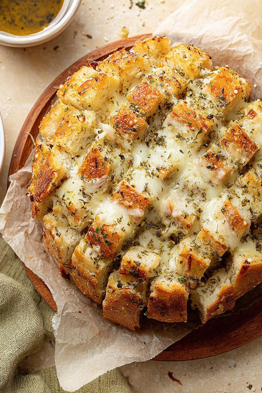 Cutting bread half-depth is crucial but tricky — use a serrated bread knife, don’t rush. Stop midway to keep loaf structure so it pulls apart cleanly and holds shape on baking sheet. Stuffing cheese too tightly squishes bread, too loose and you get cheese on tray not inside. Warm oil helps distribute flavors and prevents dryness, but don’t drench bread or it sogs. Covering foil traps moisture to warm through, prevents crust from becoming too crisp early, ensuring melty cheese pockets. Broil last step is all about timing— cheese must bubble and brown, not burn. Smell shifts from sweet garlic to toasted notes tells you time’s up. Sauce can be prepped any time before baking, easy to tweak. Fresh lemon juice brightens, smoky paprika balances fat. No dipping sauce substitute? Use plain garlic butter but add a squeeze of lemon for zip. Pull apart immediately after broil while cheese hot and stretchy. Cool bread loses stretch and becomes clumpy. Leftovers reheat wrapped in foil at 300°F until warm, about 8-10 minutes. Avoid microwave which makes bread gum-like.