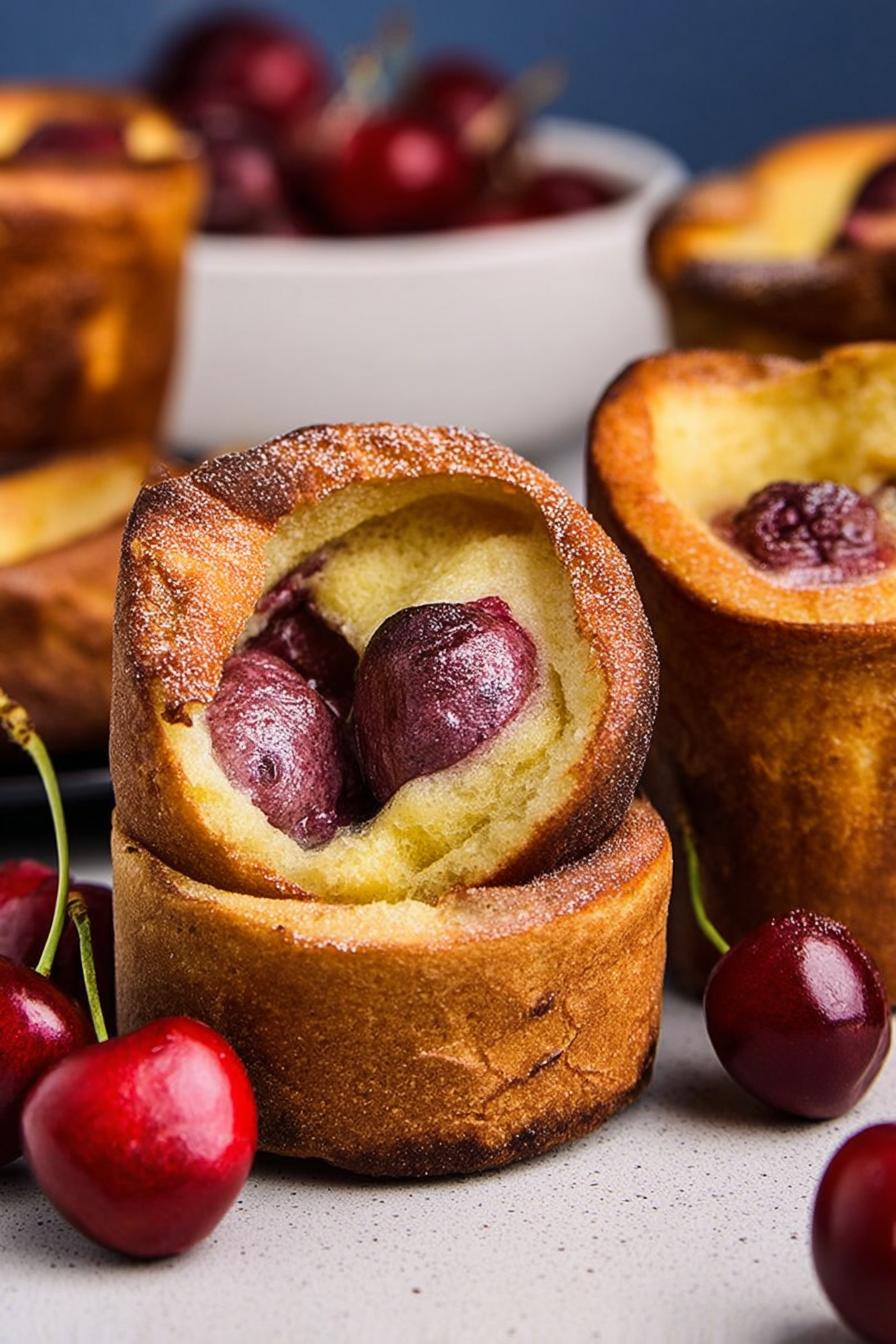 Popovers rely on steam. Wet batter with plenty of eggs, poured into a searing hot pan, puffs up into hollow golden cups. Cherries tossed with sugar release juices but folding gently avoids losing air. Almond extract swaps vanilla for a subtle nutty note; alternative twist. Poke holes when done to stop sogginess from trapped steam inside. Butter brushed on top melts into sugar, crunchy taffy coat forms. Don’t open door often or batter collapses—temperature and timing crucial. Serve right after baking, or it’s all downhill fast. Look for bubbling, amber edges, firm tops to know when pulled.