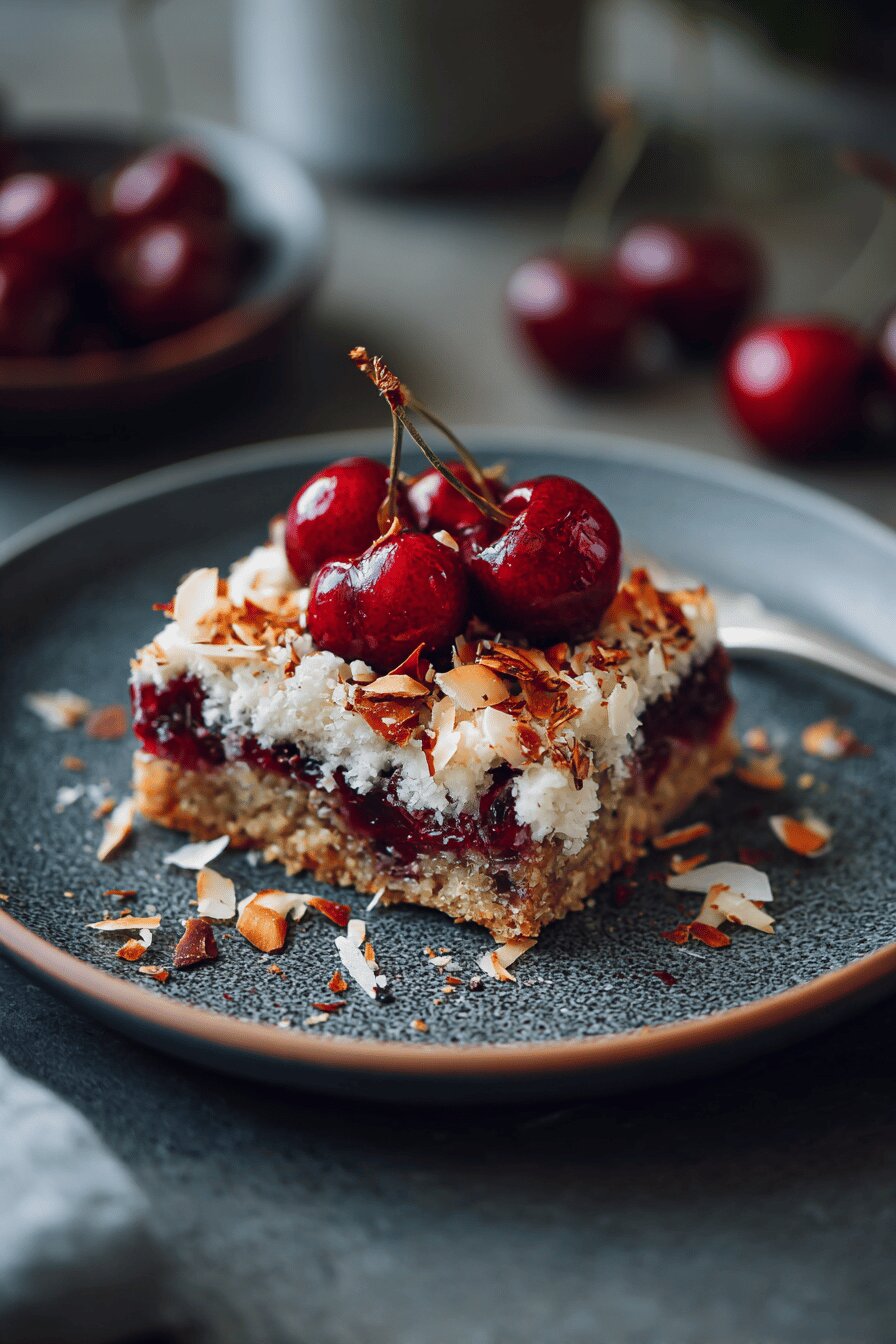 Sorghum flour replaces white flour for a tender crumb edge when gluten-free is needed. Powdered sugar integrated in the dough prevents graininess while providing subtle sweetness. Butter must be softened not melted—warm, pliable, easy to press but not greasy. Almond meal should be fresh; stale nuts ruin flavor. Cornstarch and a touch of flour give structure without toughness. Kirsch sharply cuts sweetness, accenting cherry flavor over amaretto’s mellow nuttiness. Drain fruit very well or cream will weep. Toasted coconut flake adds crunch, aroma, an unexpected twist. Feel free to swap coconut for crushed macadamia for texture if allergic. Don’t substitute margarine—loses flavor and texture. Eggs room temp for better emulsion, no scrambled curds. Milk adds fluidity; whole milk preferred but plant milk like oat works as alternative.