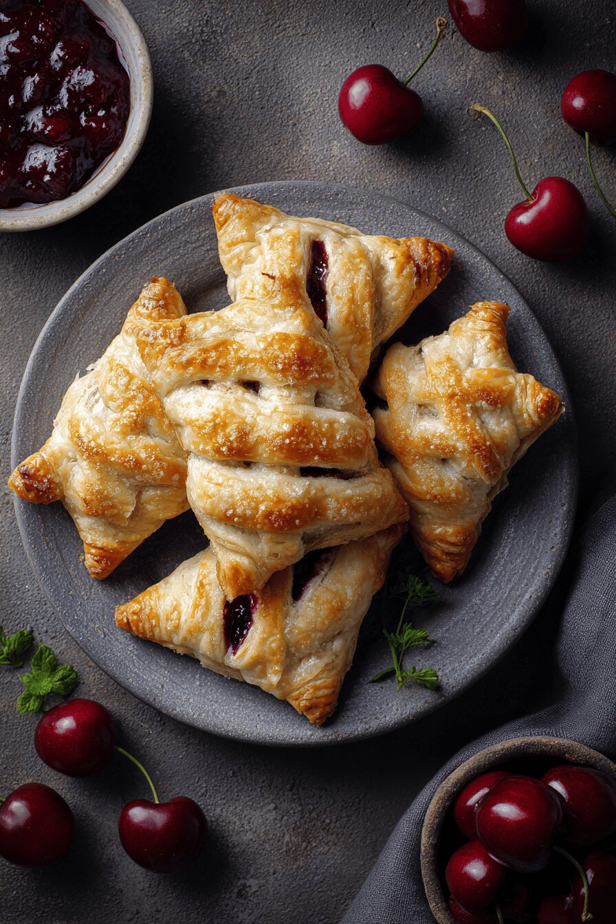 Semi-flaky pastry pockets filled with a tart cherry and cream cheese mixture. The filling is thickened with potato starch instead of cornstarch, and mascarpone replaces quark for a richer texture. The pastry lattice top vents steam for a crispy finish. Uses frozen cherries and tangy preserves. Baking times and steps slightly adjusted to optimize filling set and crust color. Ideal for quick dessert or snack. No nuts, naturally gluten-free pastry possible with store-bought dough alternatives.