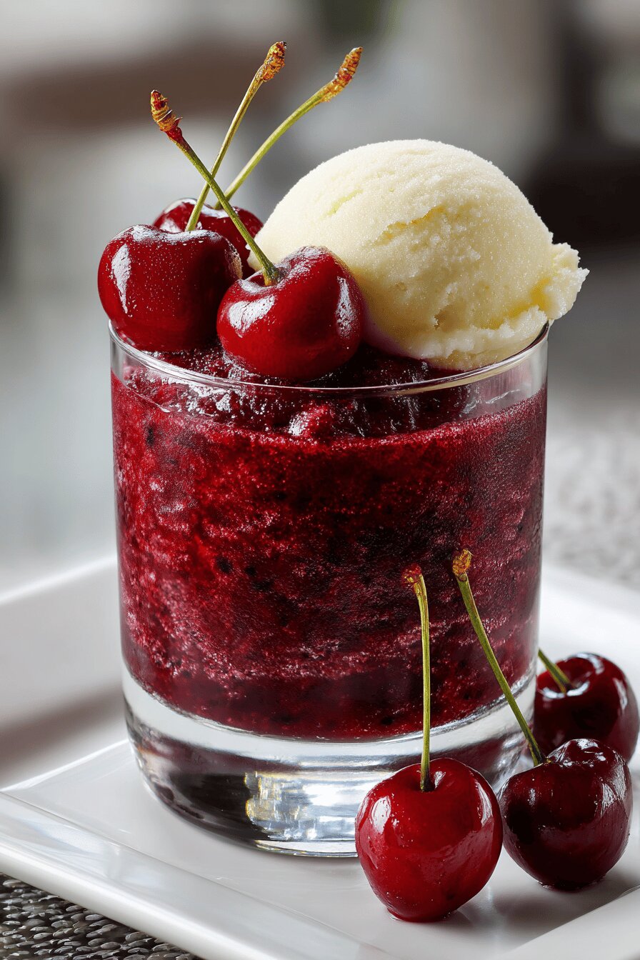 Frozen cherries, sugar, water, and orange juice become a vibrant slush, paired with creamy lemon sorbet. No eggs, nuts, or gluten. A semi-frozen fruit treat with a citrus twist, balanced sweetness, and a cool finish. Slightly less sugar, added orange juice instead of lemon, and a hint of lavender syrup. Quick simmering, straining, chilling, then churning. Serve immediately for a scoop of sorbet melting into the fruit slush.