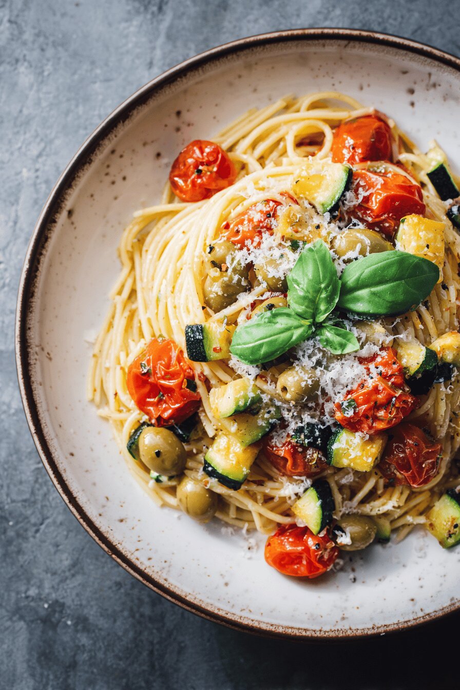 Spaghetti tossed with sautéed diced zucchini and blistered cherry tomatoes cooked down to a thick sauce. Kalamata olives replaced by green olives for a different brine note. Parmesan swapped for pecorino romano, adds sharper salty punch. Garlic swapped with a hint of chili flakes for subtle kick. Cook pasta al dente with some starchy water reserved to loosen sauce if needed. Onion and garlic softened but not browned to keep brightness. Basil added at end for fresh aroma. Total time about 50 minutes. Four serves. Mediterranean-inspired, vegetarian, no nuts dairy/oil egg-free substitutions possible.