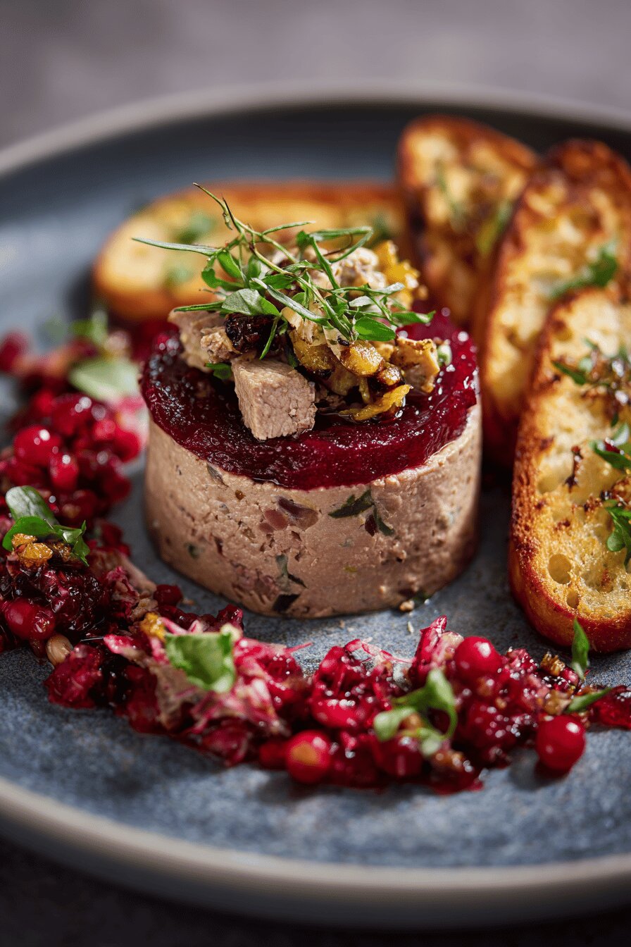 Liver mousse melds creamy fat with sharp aromatics. Cranberry jelly cuts richness with bright tang, agar agar lends cleaner set with less cloudiness than gelatin; it needs gentle heating, no boiling. Rosemary swaps thyme—stronger scent, more piney, matches brandy better than gin’s herbal bite. Pink peppercorns replace juniper berries—milder, aromatic with fruity notes. Shallot chutney rounds flavors: sweet, tart, boozy. Why vermouth? Adds acidity, complexity without overpowering. Keep livers tender—gray not brown, just shy of full firm. Whipping cream lightens texture; fold carefully. Chill times vary; look and feel for readiness, not watch. Cross-check chilling firmness before slicing, or tidiness suffers. Serve with crusty, toasted sourdough, dusted black pepper. Good textures start in mise en place. Do not rush.