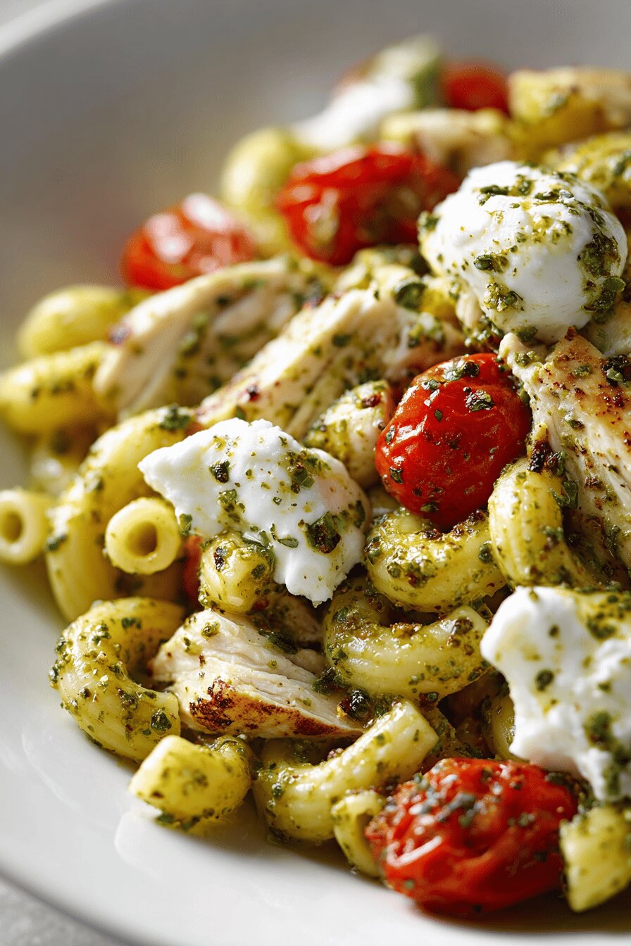 Macaroni tossed with basil pesto, pan-seared chicken strips, and juicy grape tomatoes paired with soft burrata chunks. A spin on classic Italian flavors, swapping bocconcini for rich burrata and standard tomatoes for grape tomatoes to boost sweetness. Olive oil and lemon juice offer brightness, balancing the creamy pesto. Cooking macs al dente keeps firm bite, avoiding mush. Chicken gets a golden crust from proper preheating and oil use. Assembly cold and hot provides contrasting textures.