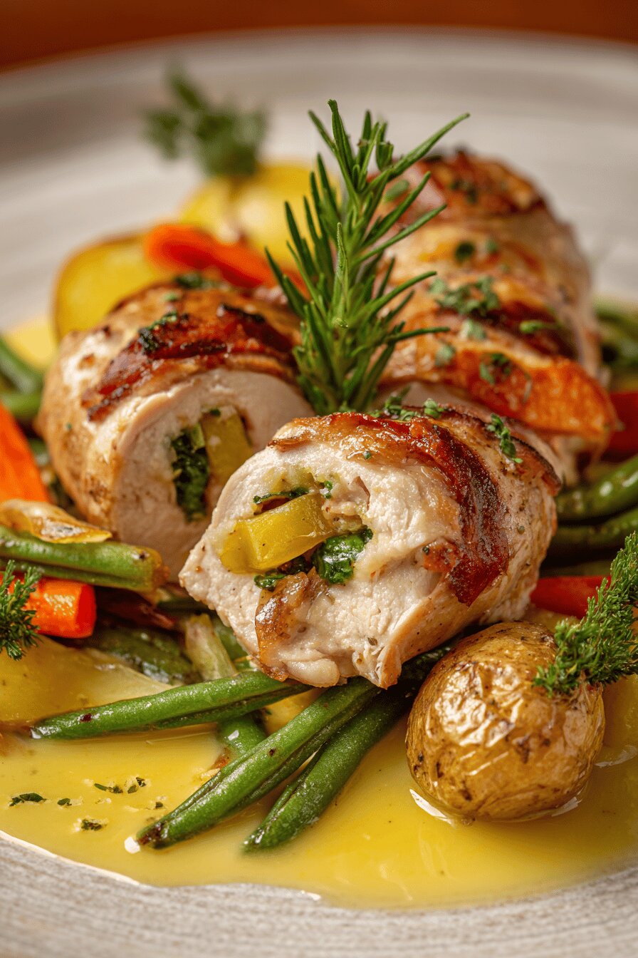 Pounding chicken breeds tenderness and even cooking. A simple vegetable medley prepared individually guards texture and flavor purity—no mashed veggies losing their identity. Autumn vegetables give earthy sweetness, balanced by acid punch from cider vinegar sauce. Classic French pan sauce technique with cold butter emulsification keeps rich mouthfeel without heaviness. A small finesse in rolling makes slicing prettier and keeps filling tucked, no leaking disaster. High heat sears exterior, locking juices inside. Resting after cooking is key; impatience breeds dry meat. Precise steps that pay off with biggest flavor bang for your effort. Ingredients swap here and there keeps it fresh, in tune with seasonal availability or allergies. Practical kitchen efficiency meets culinary discipline. Manual sensory cues trump timers every time, develop intuition—colour, texture, aroma are your guides. No clutter, just smart method. Every step earned.