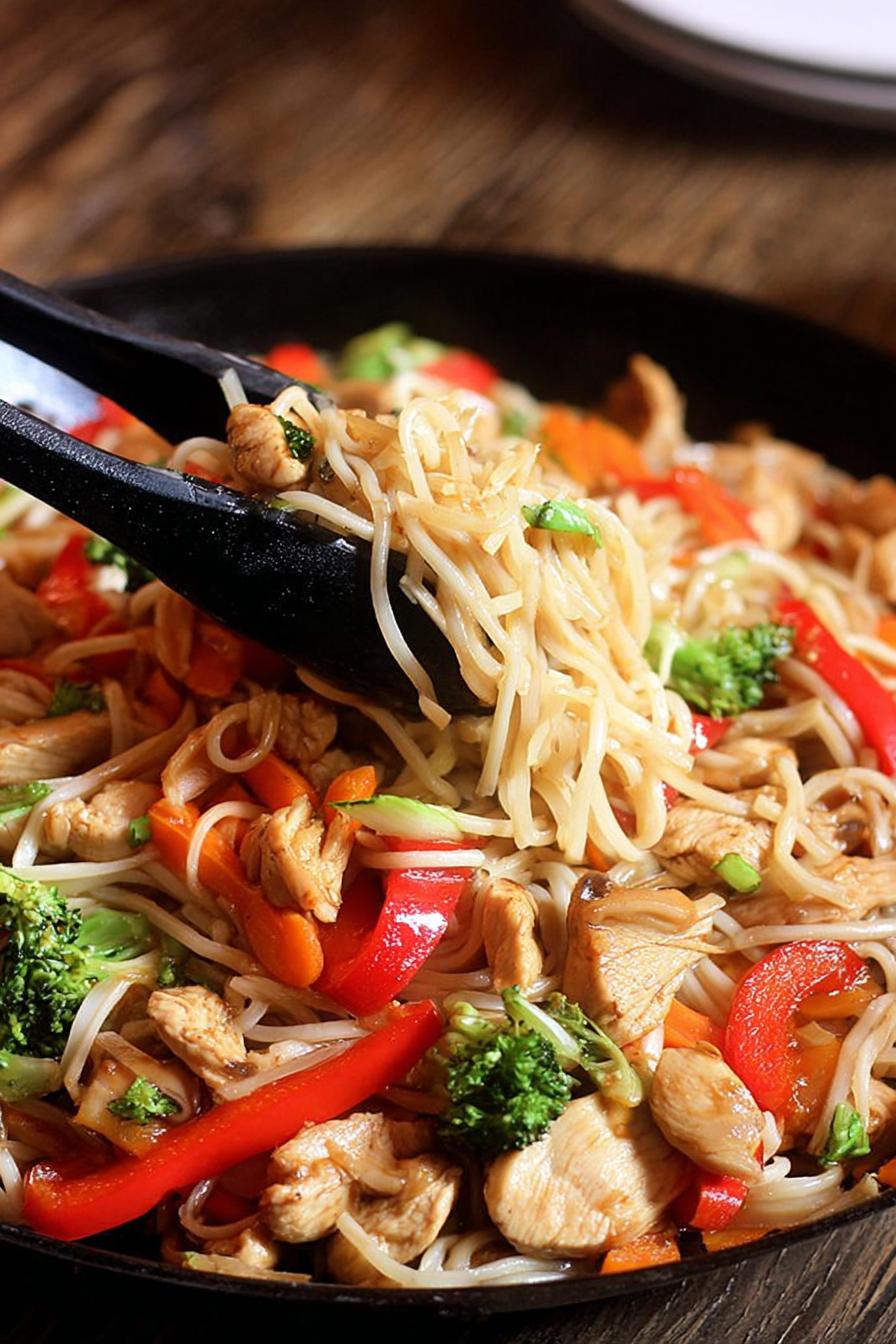 Swap rice noodles for flat udon noodles, ginger replaced by fresh turmeric, and add snap peas for snap. Chicken breasts seasoned lightly with salt, pepper, and a pinch of smoked paprika. Vegetable mix stays but swap mushrooms for water chestnuts for crunch. Sauce thickened with arrowroot instead of cornstarch. Cook chicken and veggies separately for clean sear and tender bite. Watch for garlic browning fast; toss it in late. Sauce brought up to a low boil, thickening while coating everything evenly. Toss noodles gently to avoid breaking. Serve quick to keep noodles springy and veggies crisp.